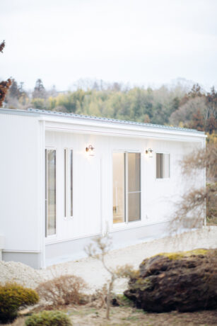 白を基調とした外観は、周囲の緑や山並みに美しく調和。シンプルながらも洗練された印象を与え、自然環境に溶け込む佇まいを実現しました。