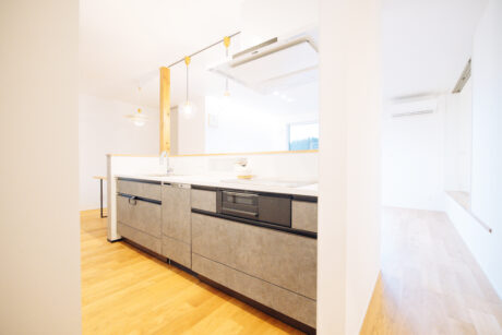 キッチンの腰壁に設けたカウンターは、お客様との会話を楽しみながらおもてなしができる場所。家族やゲストが気軽に集まる憩いのスペースです。