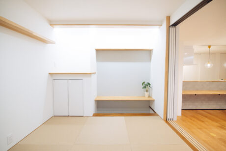 小上りの和室には学習や作業ができるカウンターを設置。家族が集まりやすい空間にしつつ、多用途に使える便利なスペースを実現しました。