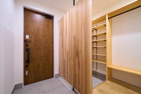 レッドシダー貼りの袖壁、造作扉がお出迎え。