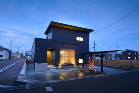 室内は優しく、外観はシックな色味を採用した分譲地内に佇む一棟。