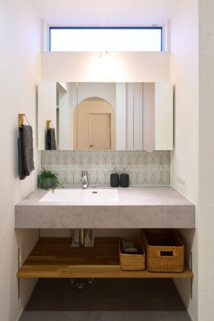 タイルの貼り方に拘った造作の洗面化粧台。