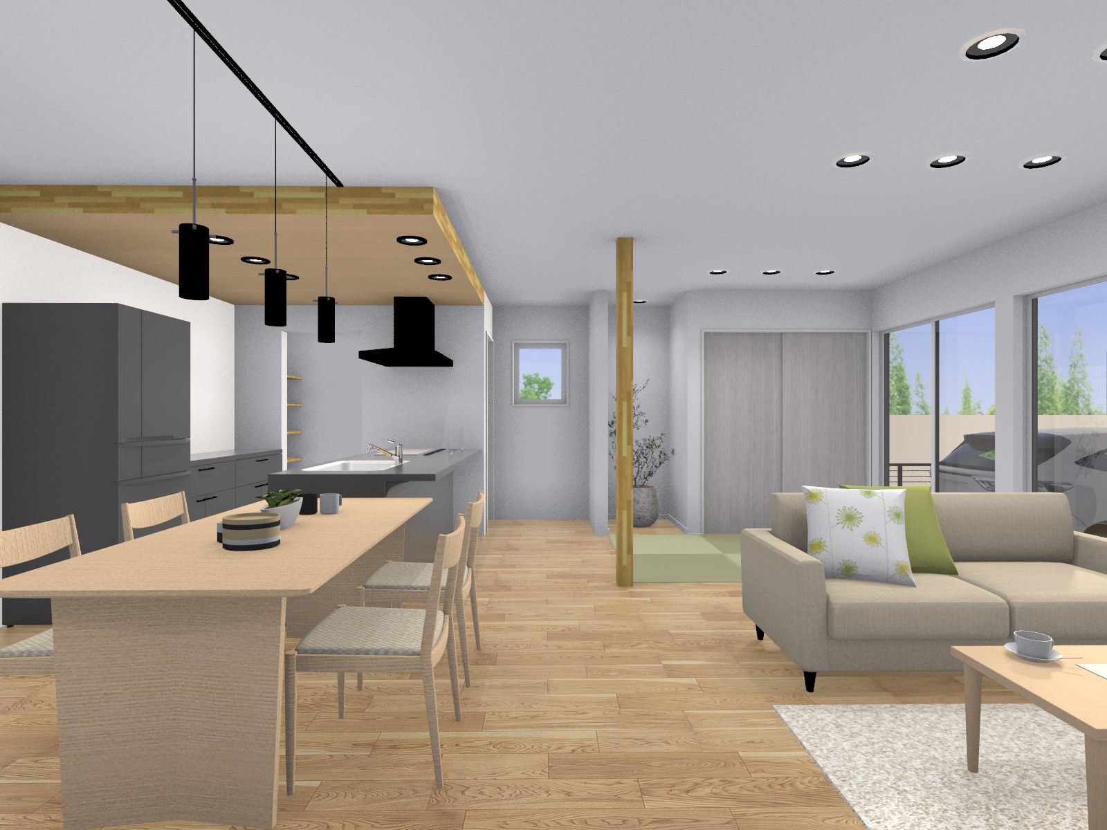 あえて扉を付けず、オープンの空間に。LDKと畳コーナー境の天井を折り上げてロールカーテンを設置。