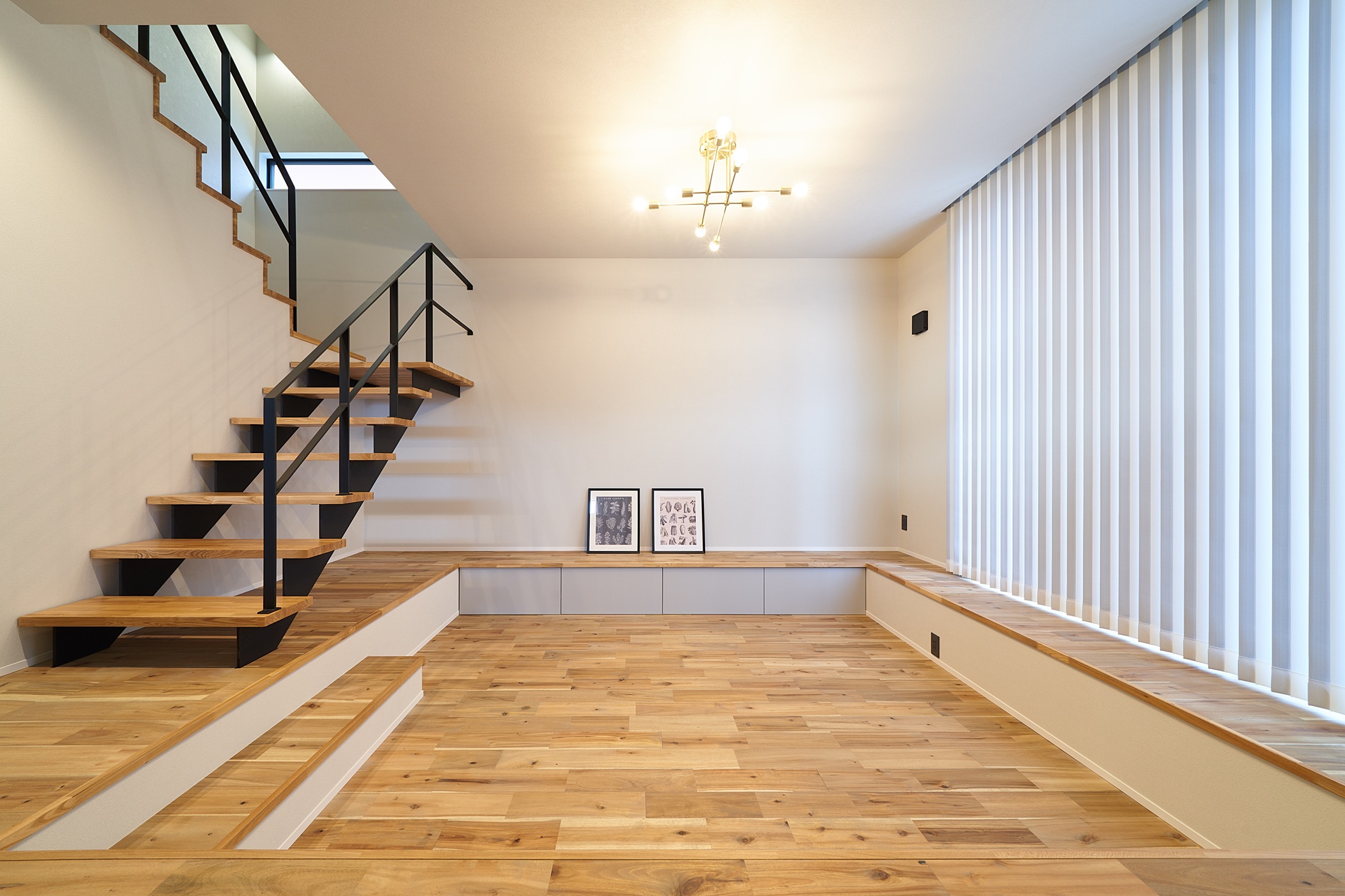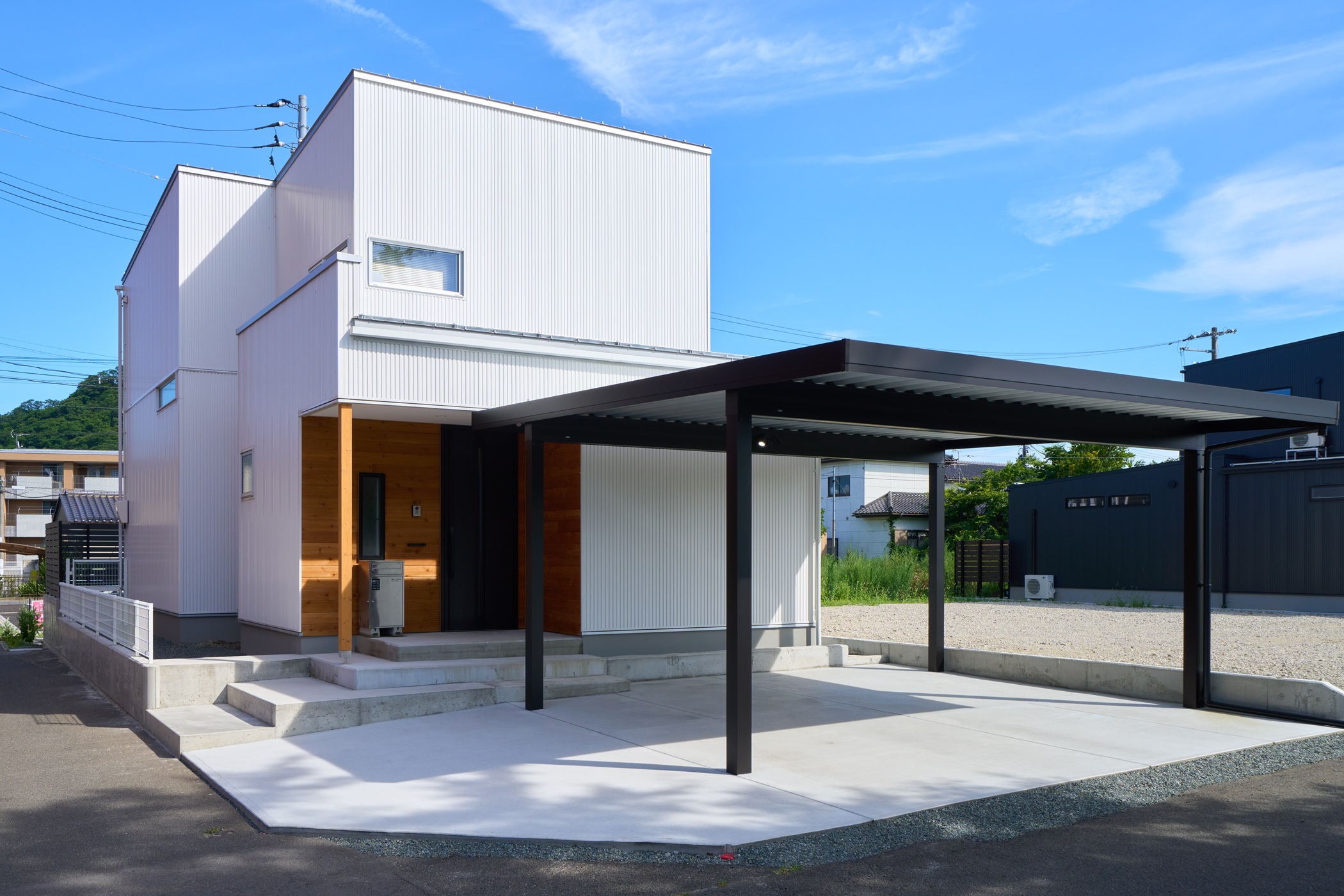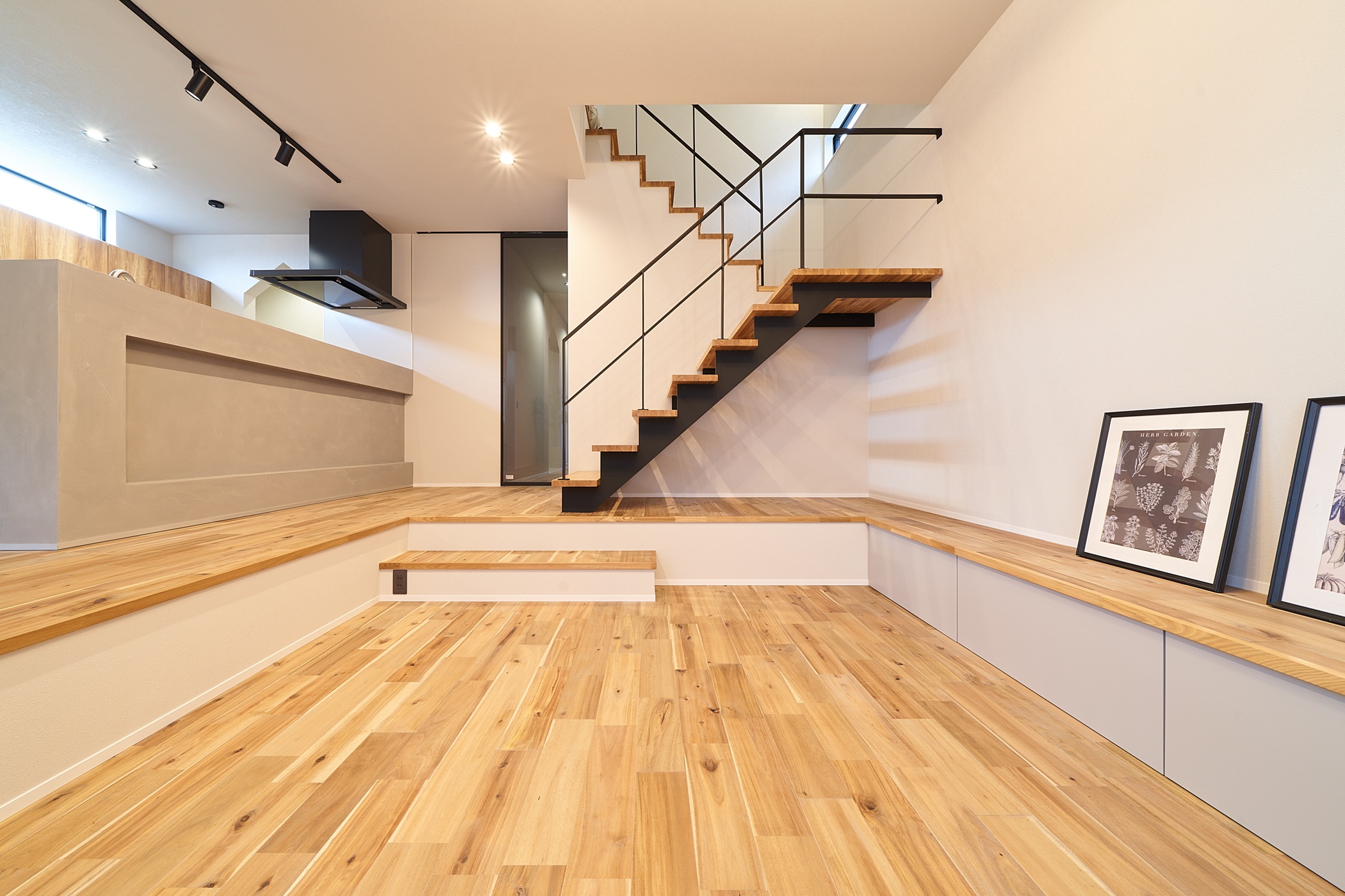 白いガルバリウムと木のアクセントが美しく調和した、 シンプルながらも洗練された印象の外観。 室内はスキップフロアとダウンフロアを取り入れ、 空間に奥行きと遊び心をプラス。 段差がつなぐ、心地よい暮らしの家が完成しました。