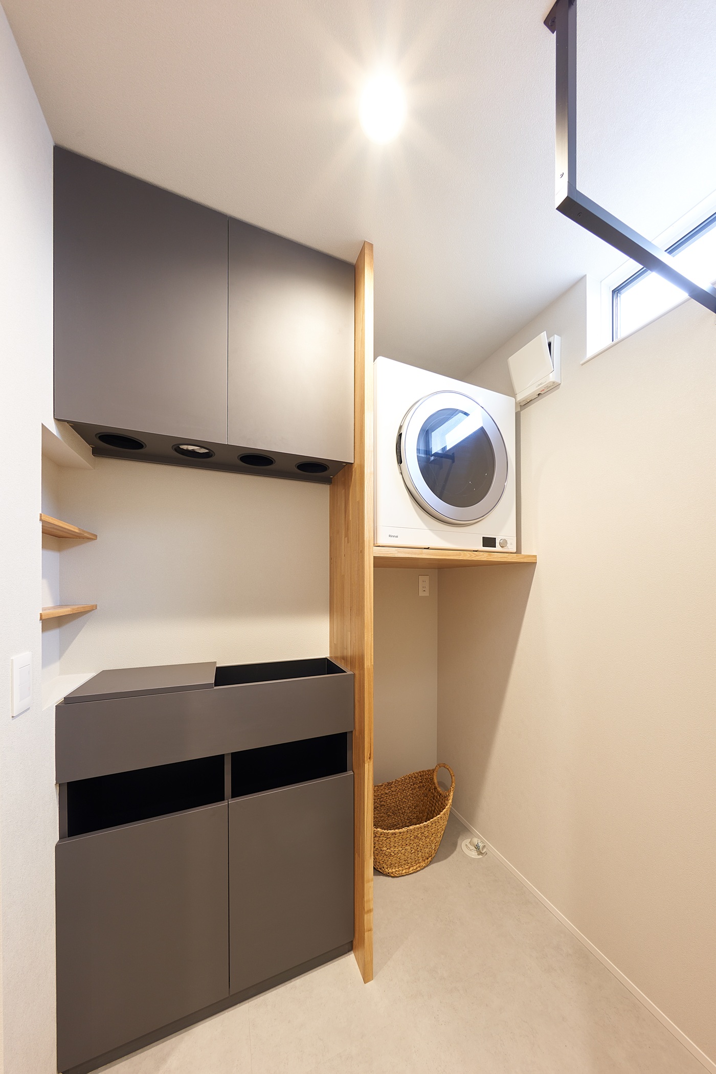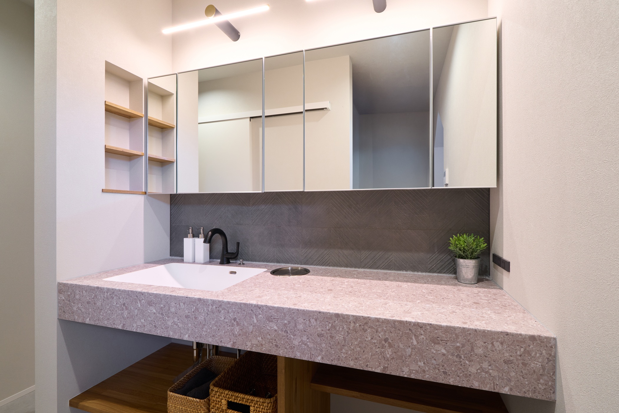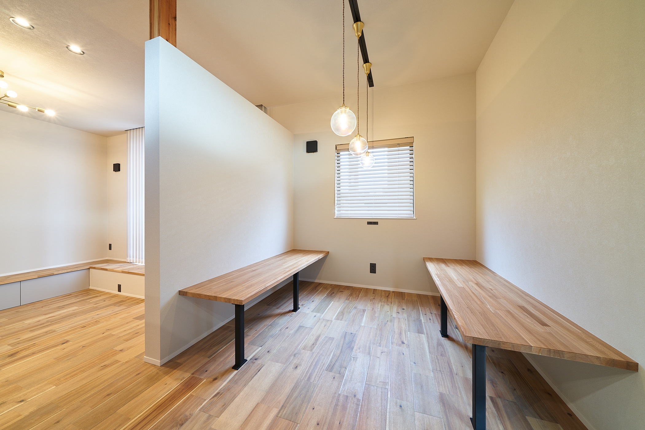 白いガルバリウムと木のアクセントが美しく調和した、 シンプルながらも洗練された印象の外観。 室内はスキップフロアとダウンフロアを取り入れ、 空間に奥行きと遊び心をプラス。 段差がつなぐ、心地よい暮らしの家が完成しました。