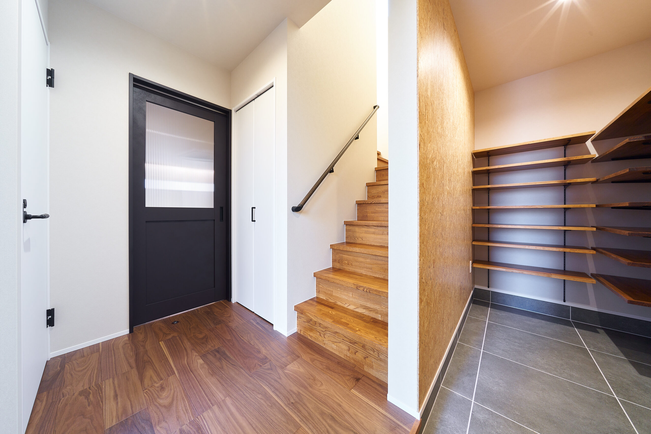 シンプルな中に温もりを宿す、暮らしのはじまり。マットな質感のブラックの外観は、静けさと洗練をまとったフォルム。木目が際立つ玄関扉がアクセントとなり、訪れる人を優しく迎え入れます。「ハジマリノト」は、その名のとおり、新たな人生のはじまりに寄り添う住まいです。