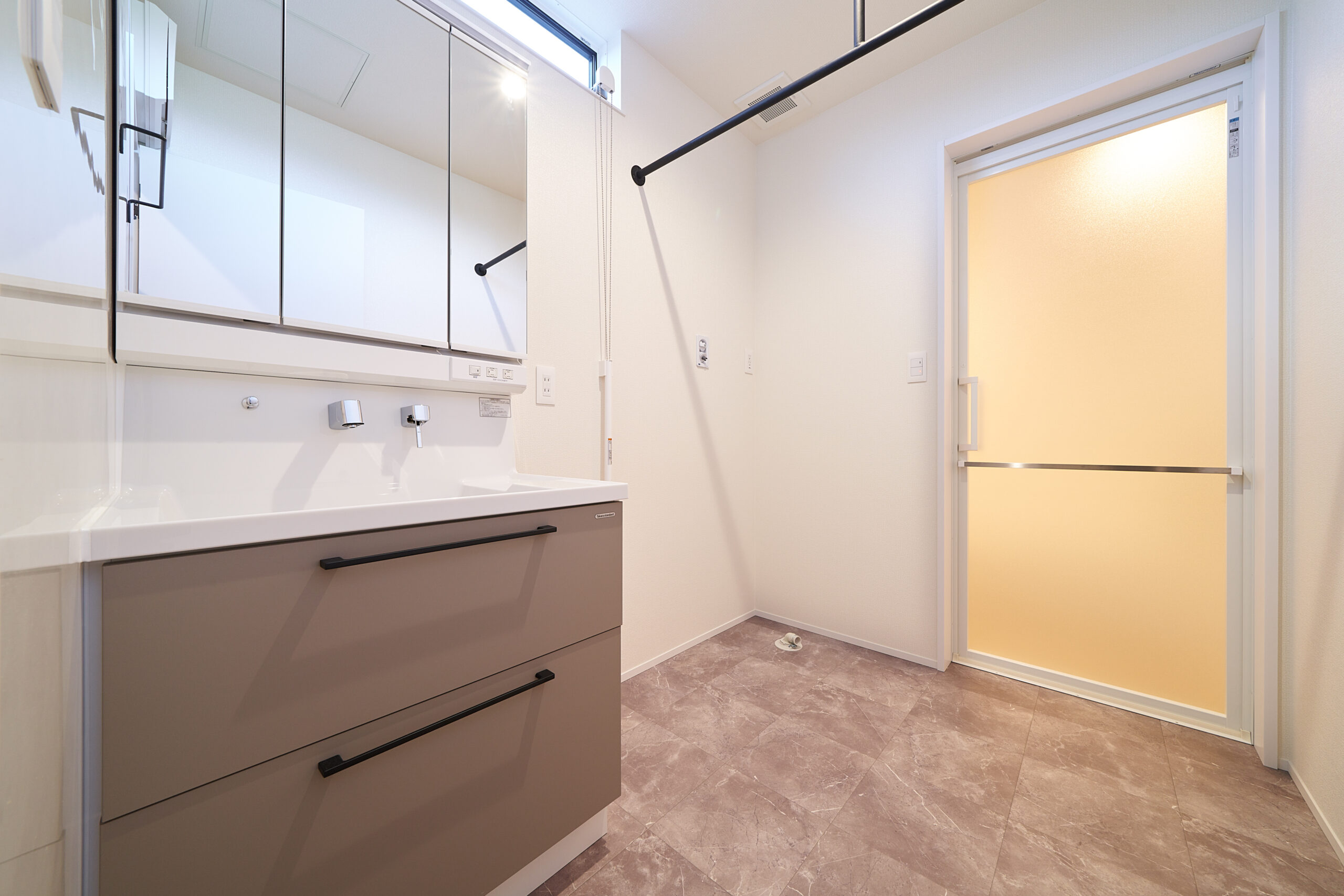 洗面脱衣所はグレージュ系の色味で統一し、シンプルな空間に