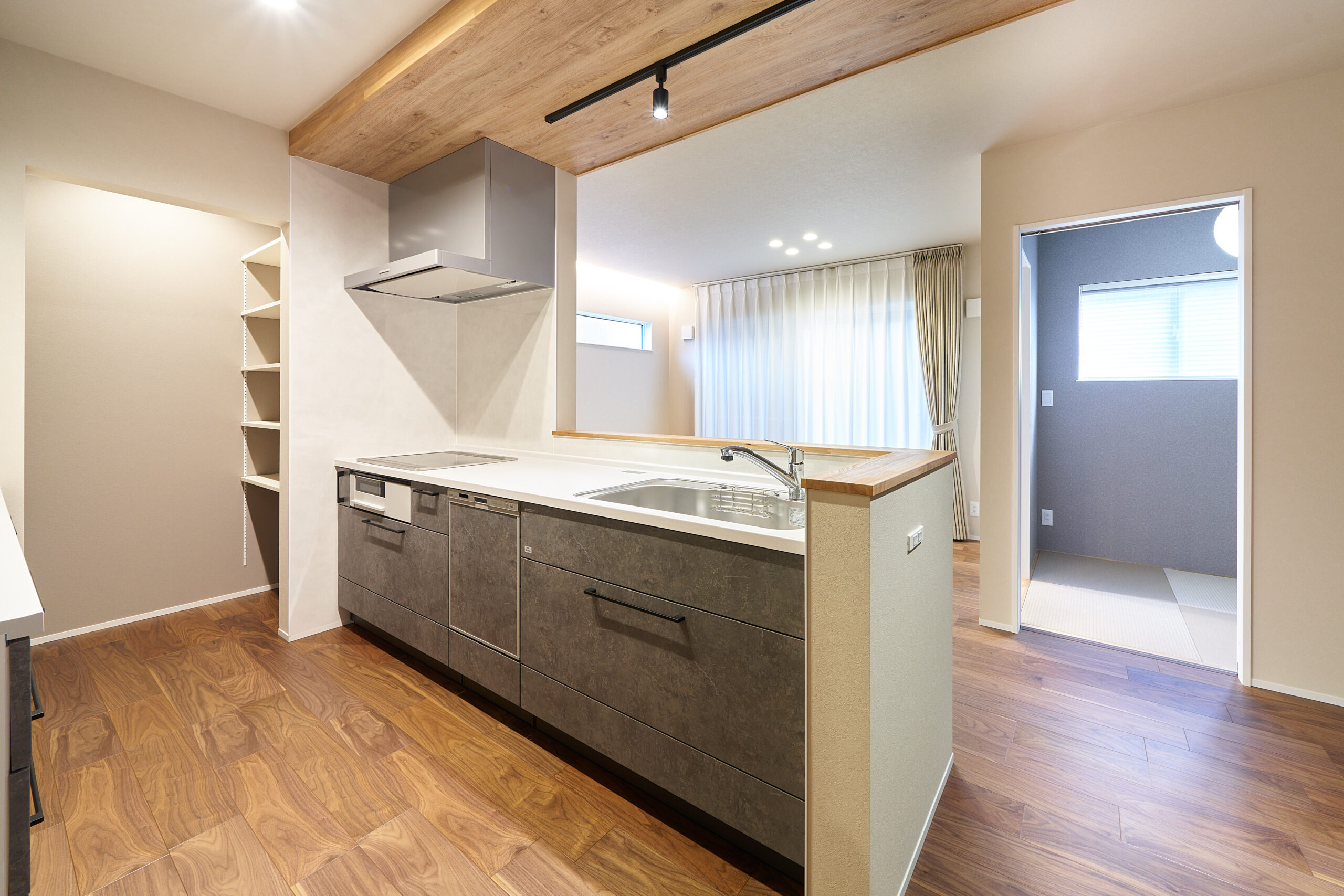 キッチンはグレートーンの扉材。笠木と天井を木で統一し落ち着きある空間に