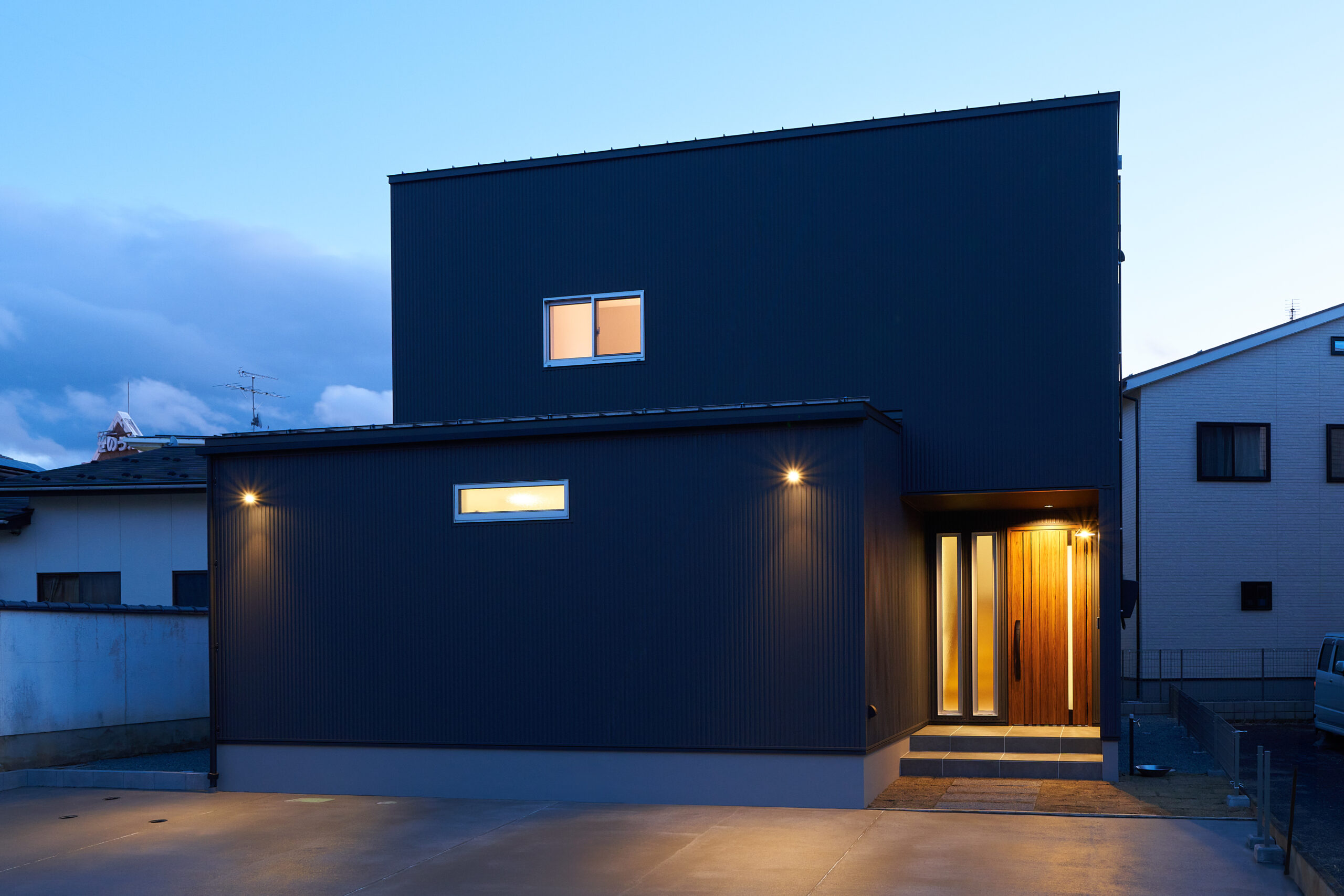 シンプルな箱型フォルムに、木目の玄関ドアが温かみを添え、昼夜で異なる表情を見せる