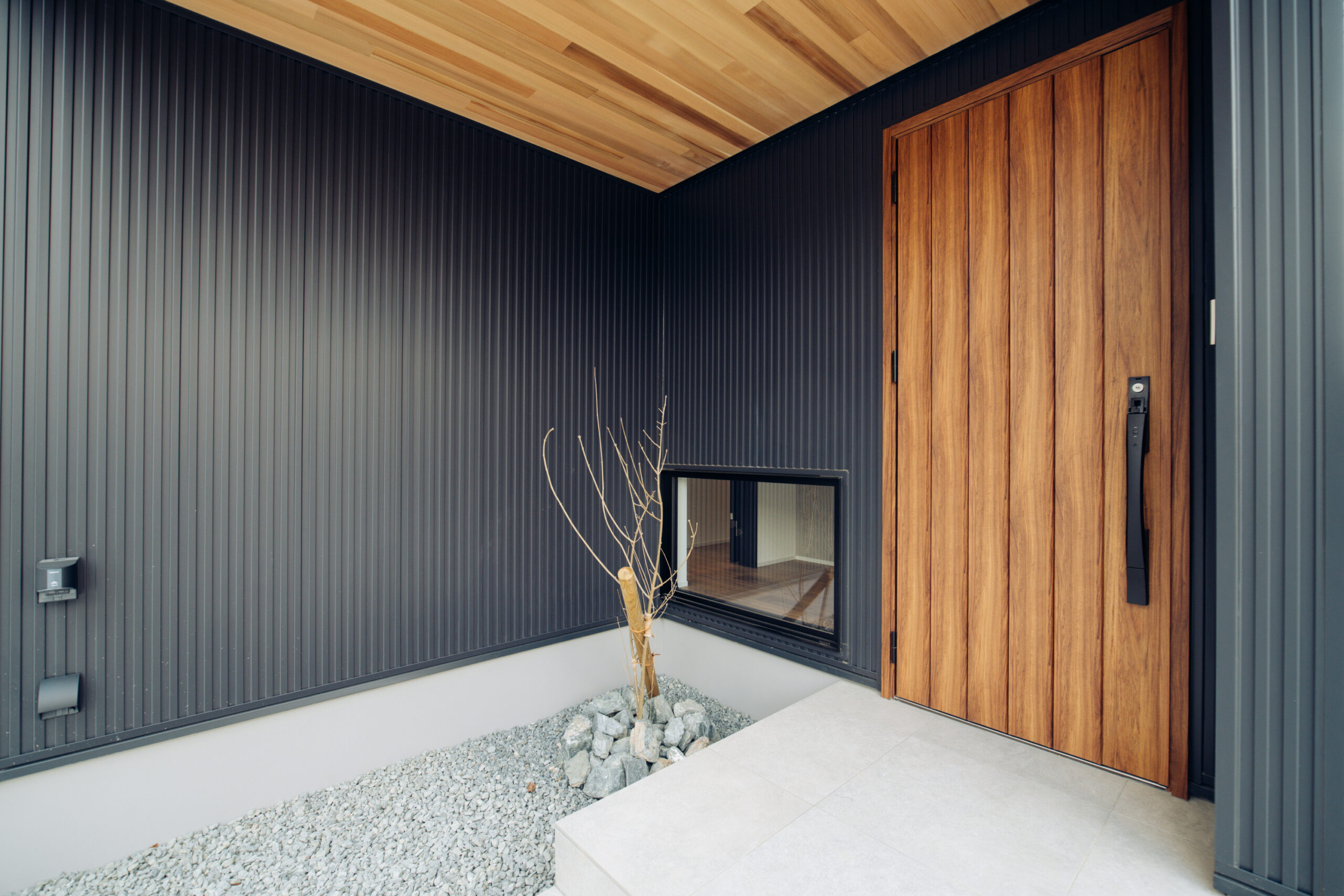 ブラック外壁の中に、木目の玄関ドアが温かみを添えるエントランス。