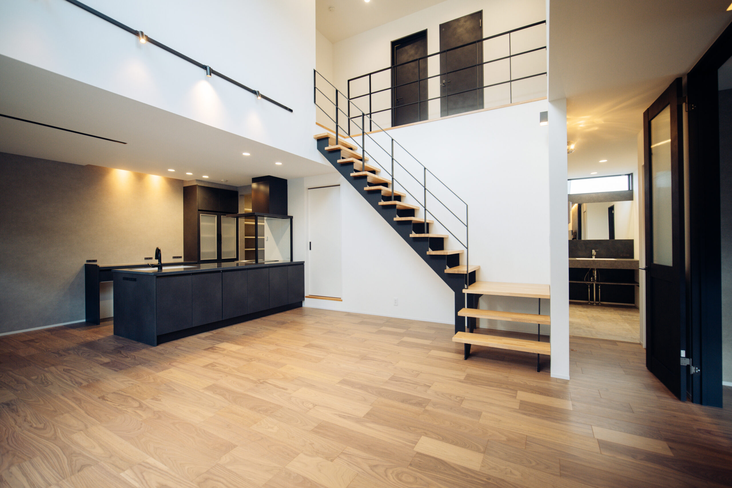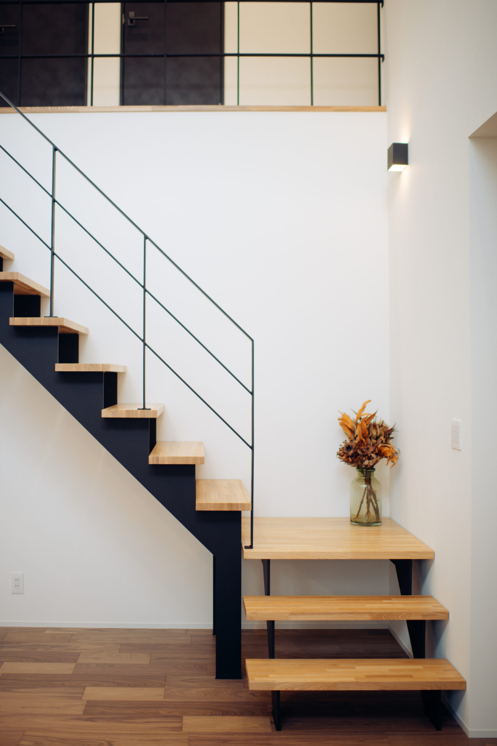 シンプルながらも質感のコントラストが際立ち、インテリアの一部として存在感を放つ階段