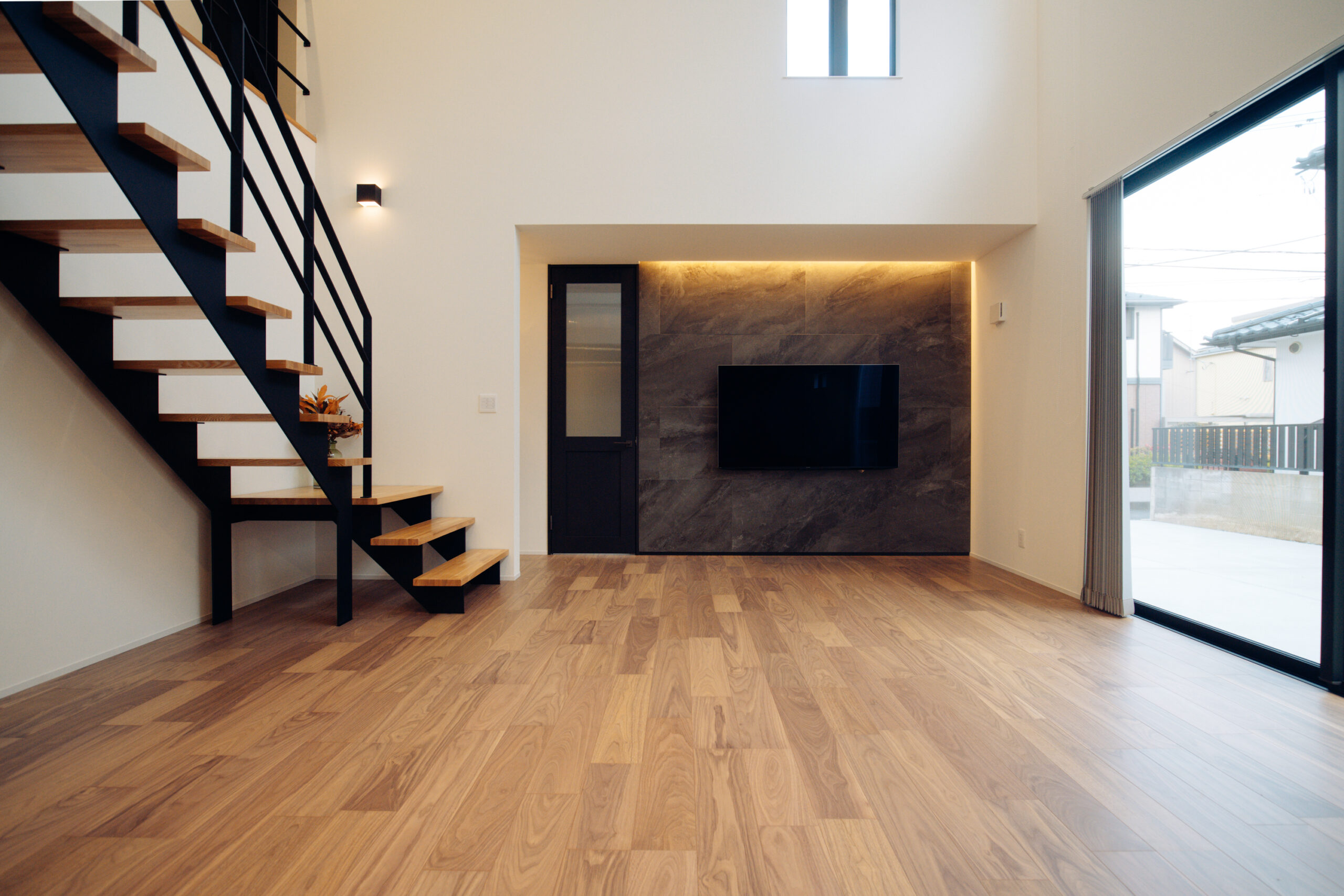 黒い外観が印象的な邸宅「NOIRIA」。シンプルかつ力強い外観デザインと、室内の開放的な空間構成が魅力的。家族が集うリビングは大きな窓から庭とつながり、外と内を緩やかに結ぶ心地よい暮らしを実現。