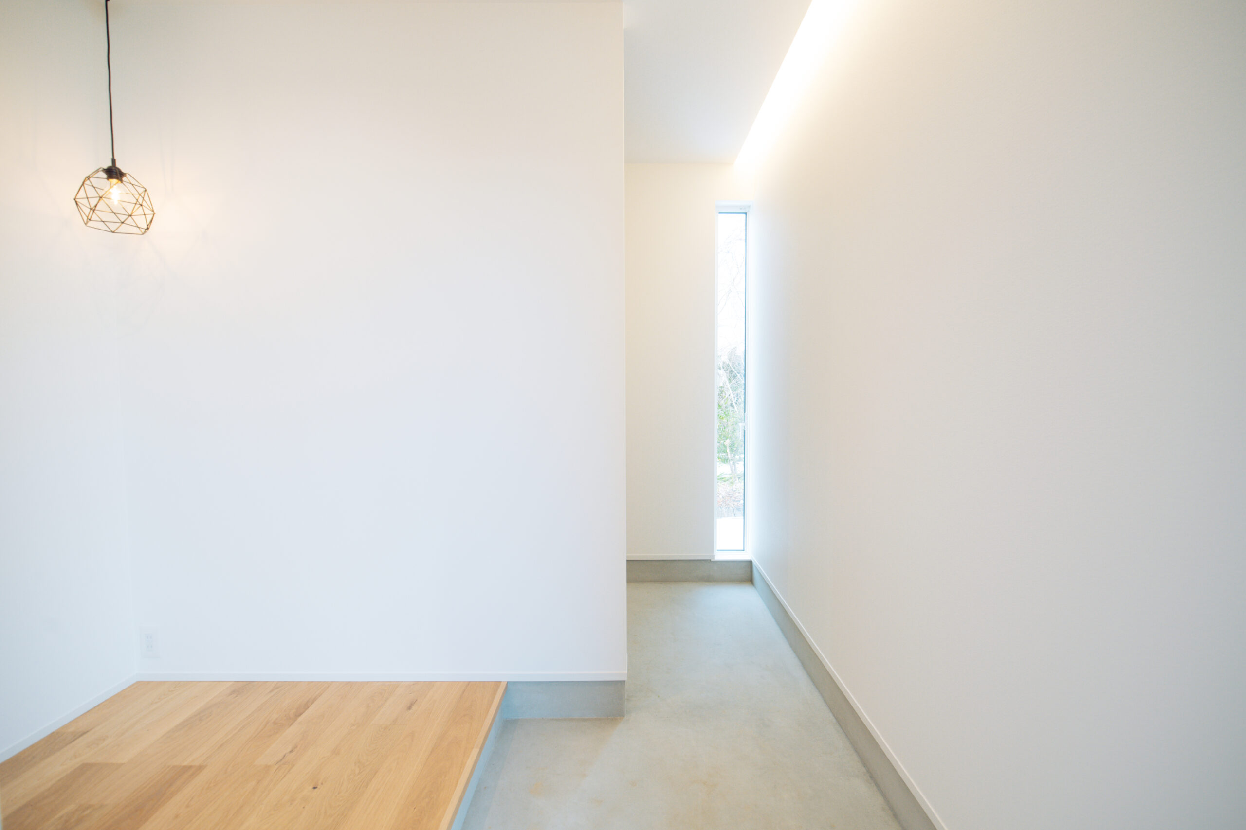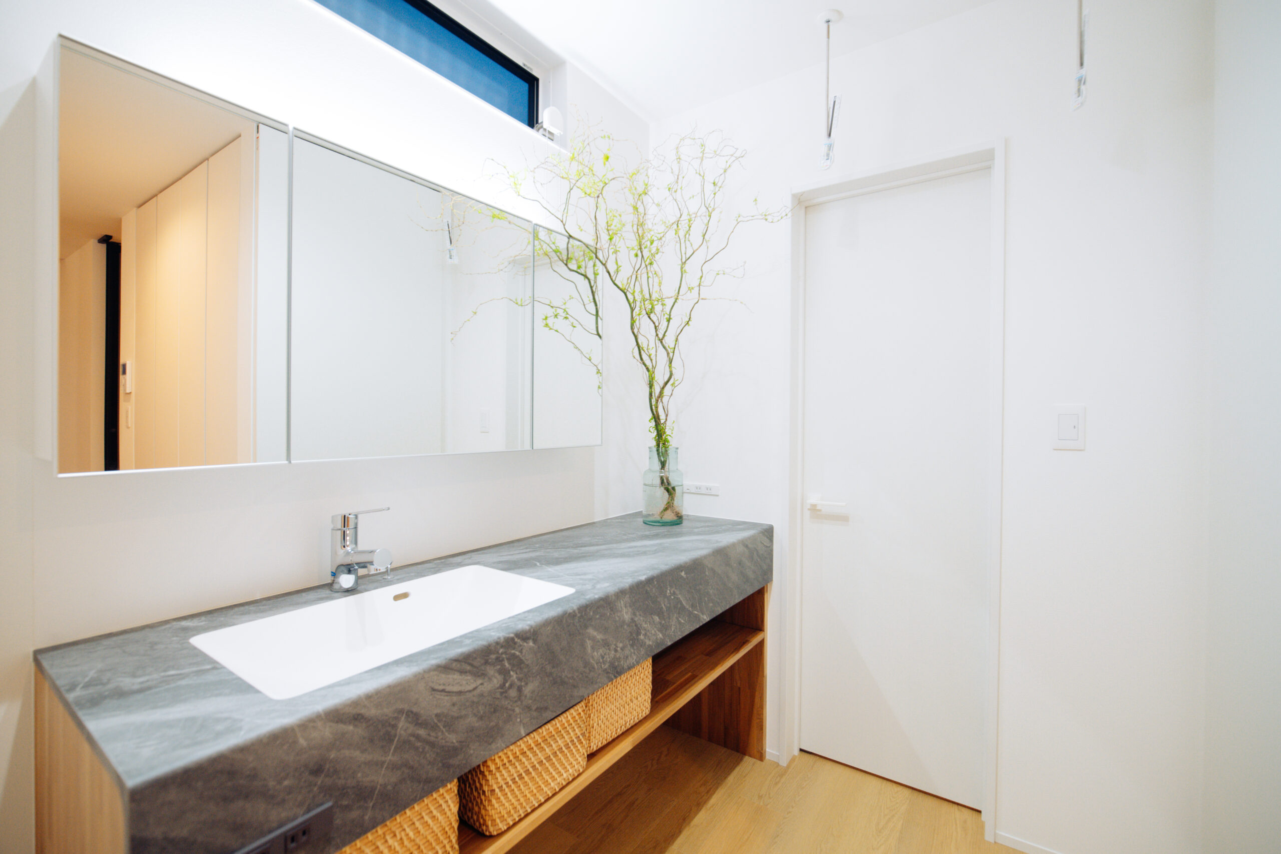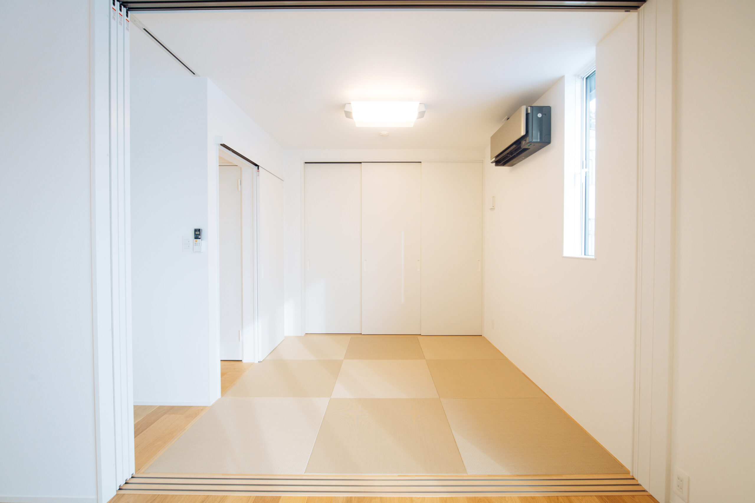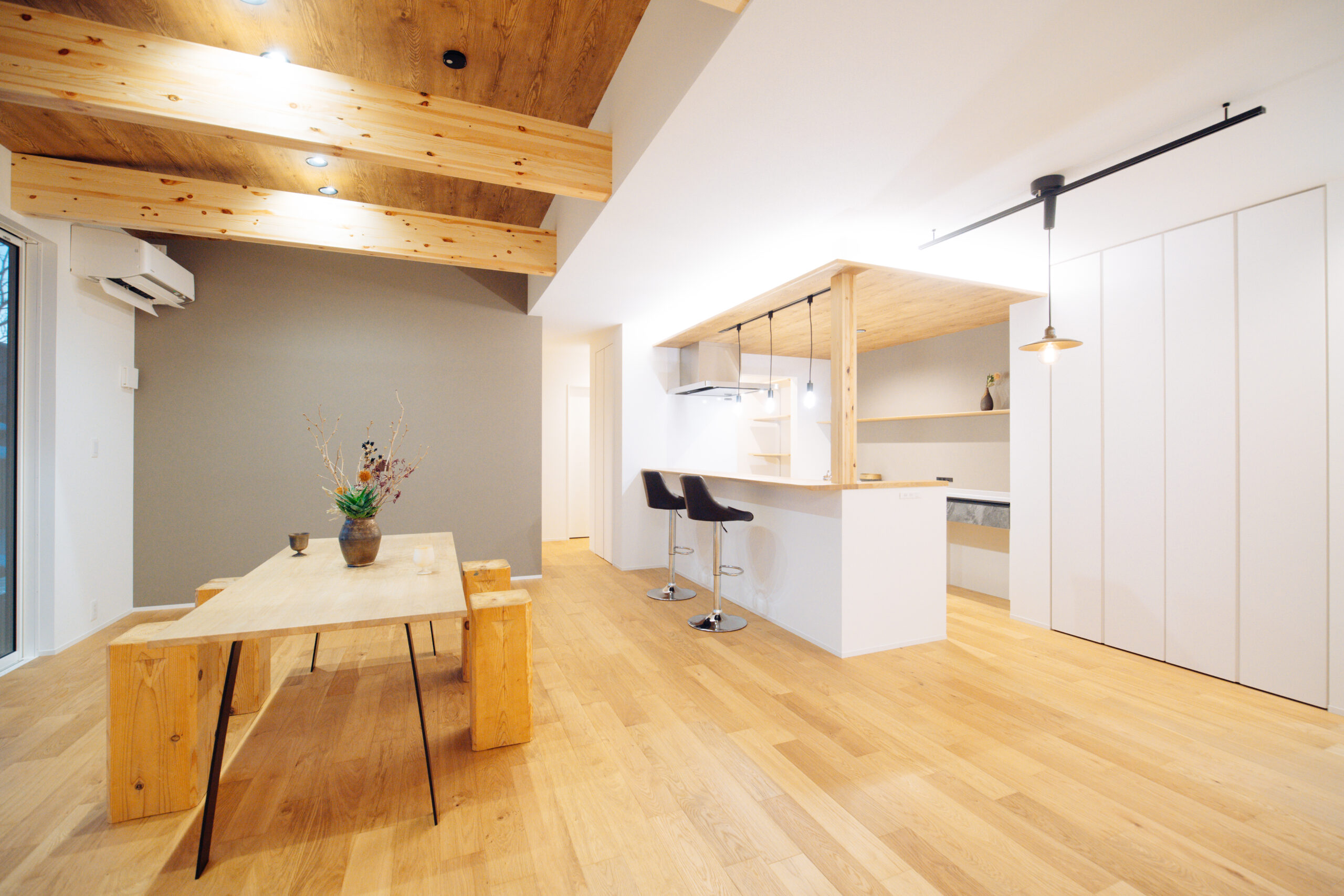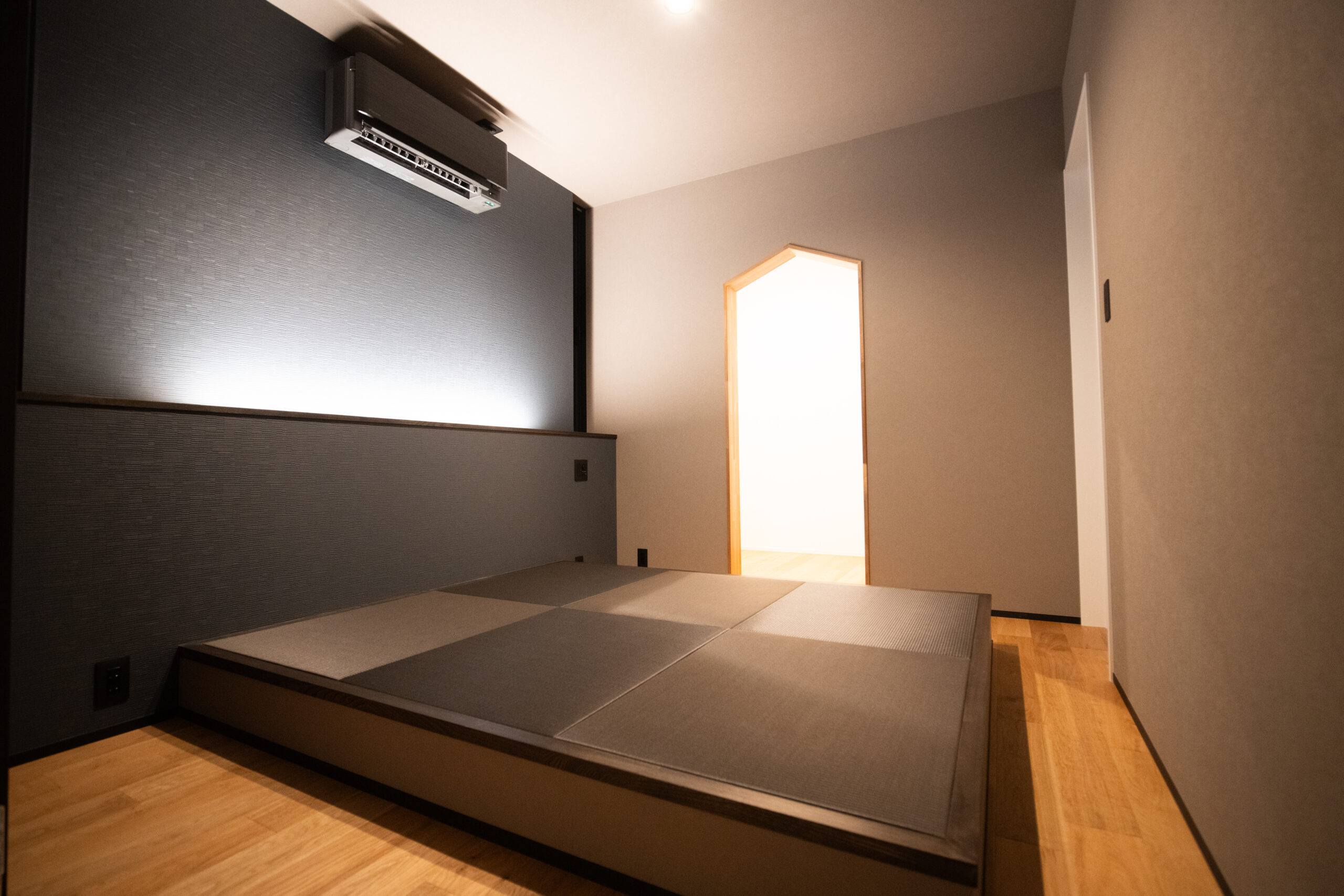 落ち着きと上品さを兼ね備えたミストブラックの外観が印象的な平屋のお住まい。玄関からお客様動線と家族動線を分けることで、来客時も生活感を見せず、スムーズにお迎えできます。キッチンの腰壁にはカウンターを設け、配膳や軽い作業にも便利。将来のライフスタイル変化を見据え、子供部屋は間仕切り可能な設計にしました。リビングの壁掛けテレビは、オーディオ機器を背面収納にまとめてすっきりと。和室は玄関から直接ご案内できる配置で、お客様を心地よく迎えられる空間になっています。