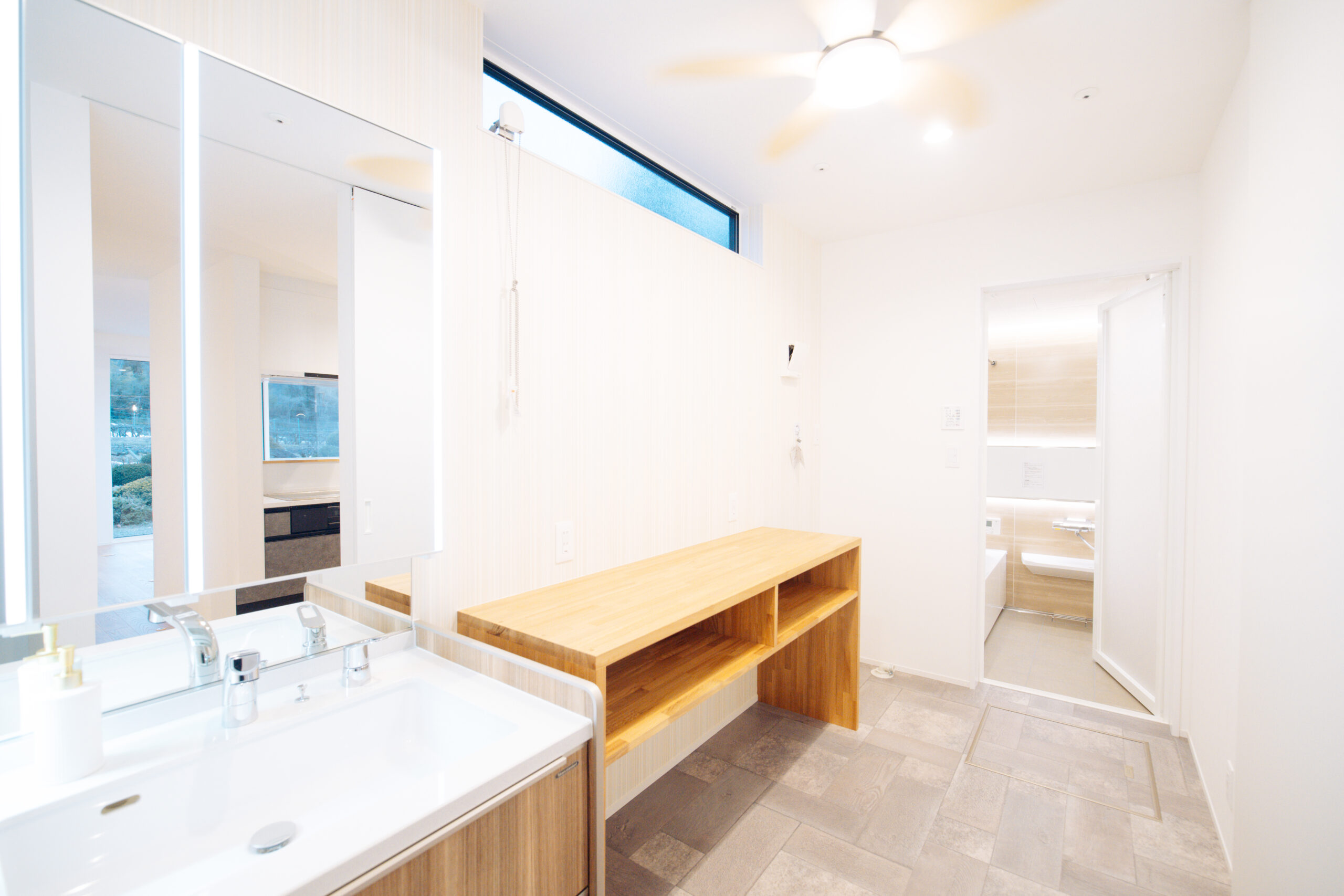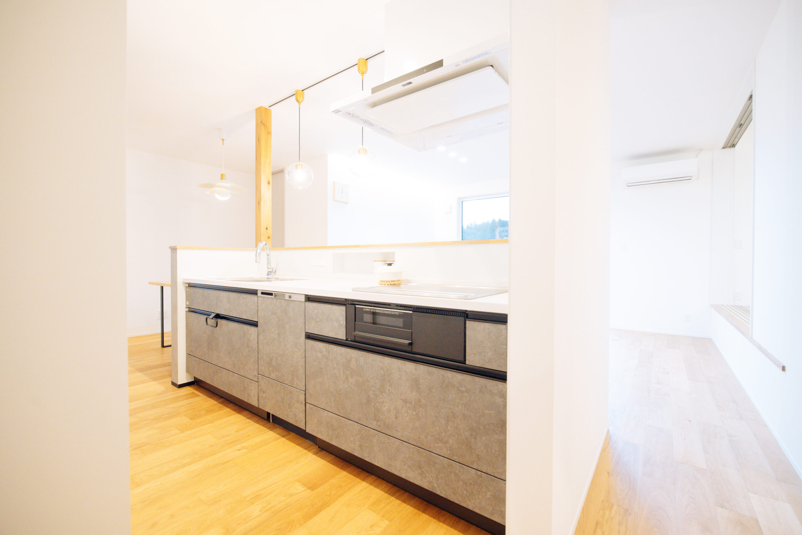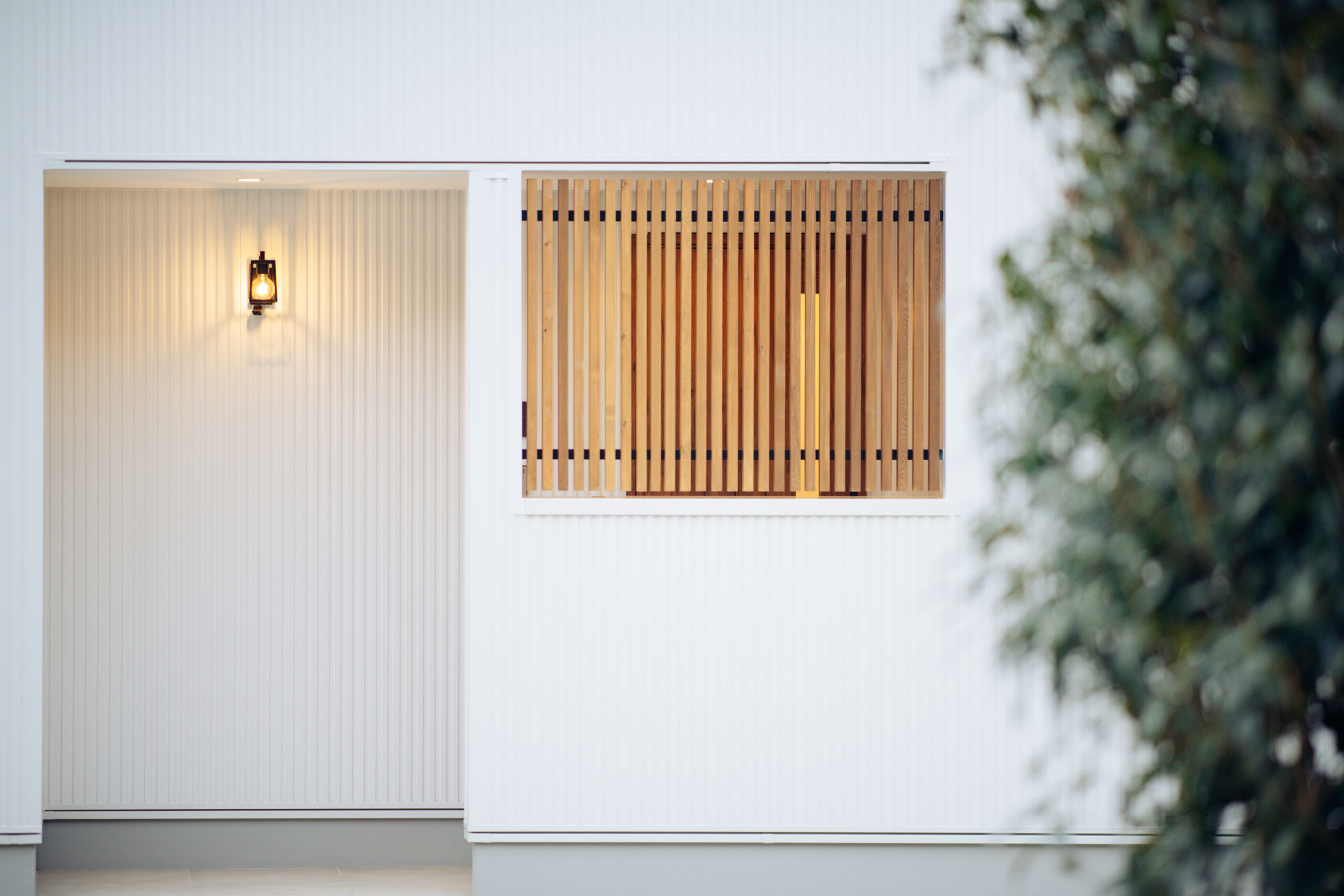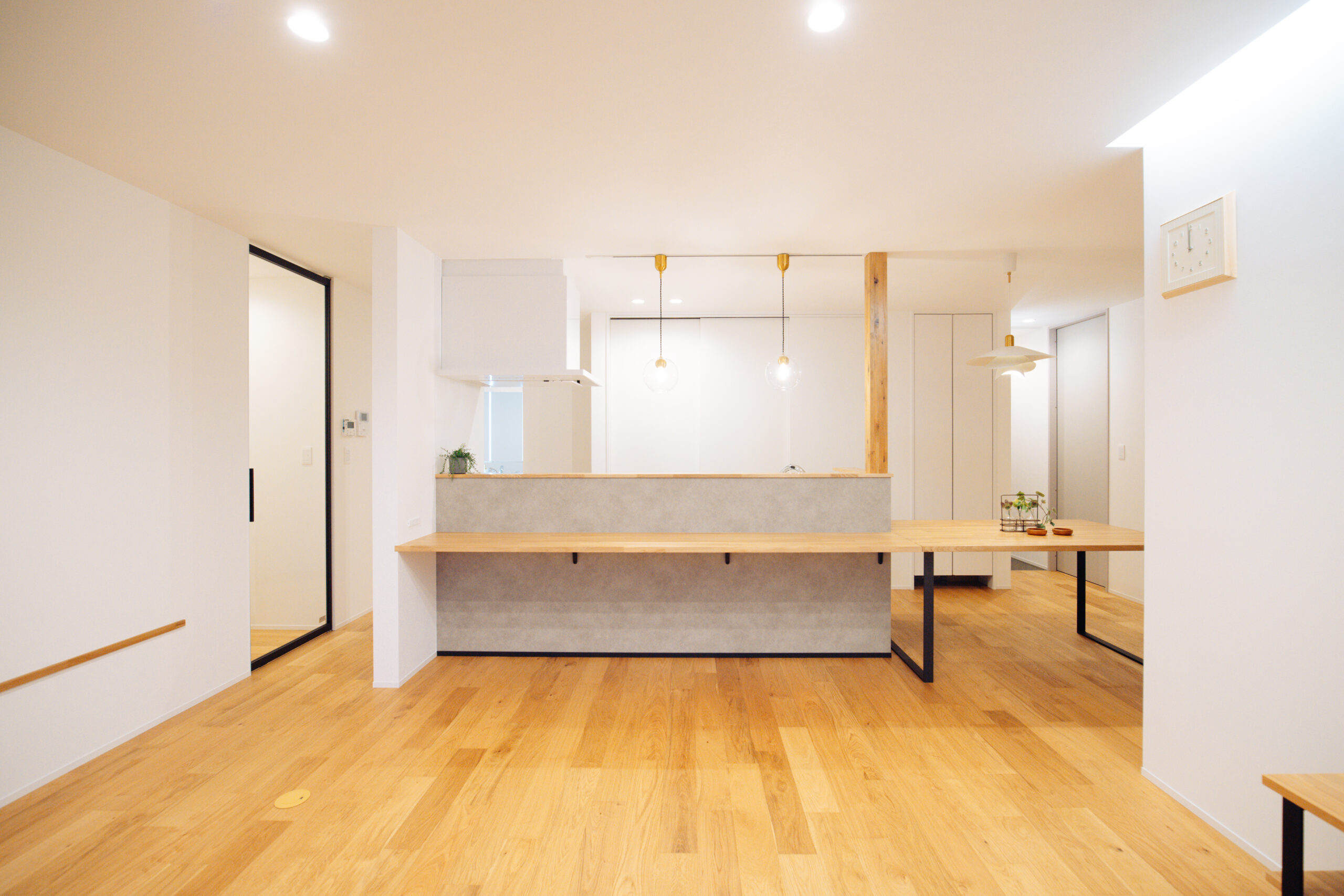 清潔感のあるホワイトの外観が周囲の緑と美しく溶け込み、平屋ならではの回遊動線を取り入れることで、家事や移動のストレスを軽減。ご家族とお客様の動線を分けた設計により、プライバシーを確保しつつ快適な暮らしを実現しています。さらに、小上り和室にはスタディスペースとなるカウンターを設置し、キッチン前のカウンターはお客様をもてなすスペースに。機能性と温かみを両立した理想的な住まいです。
