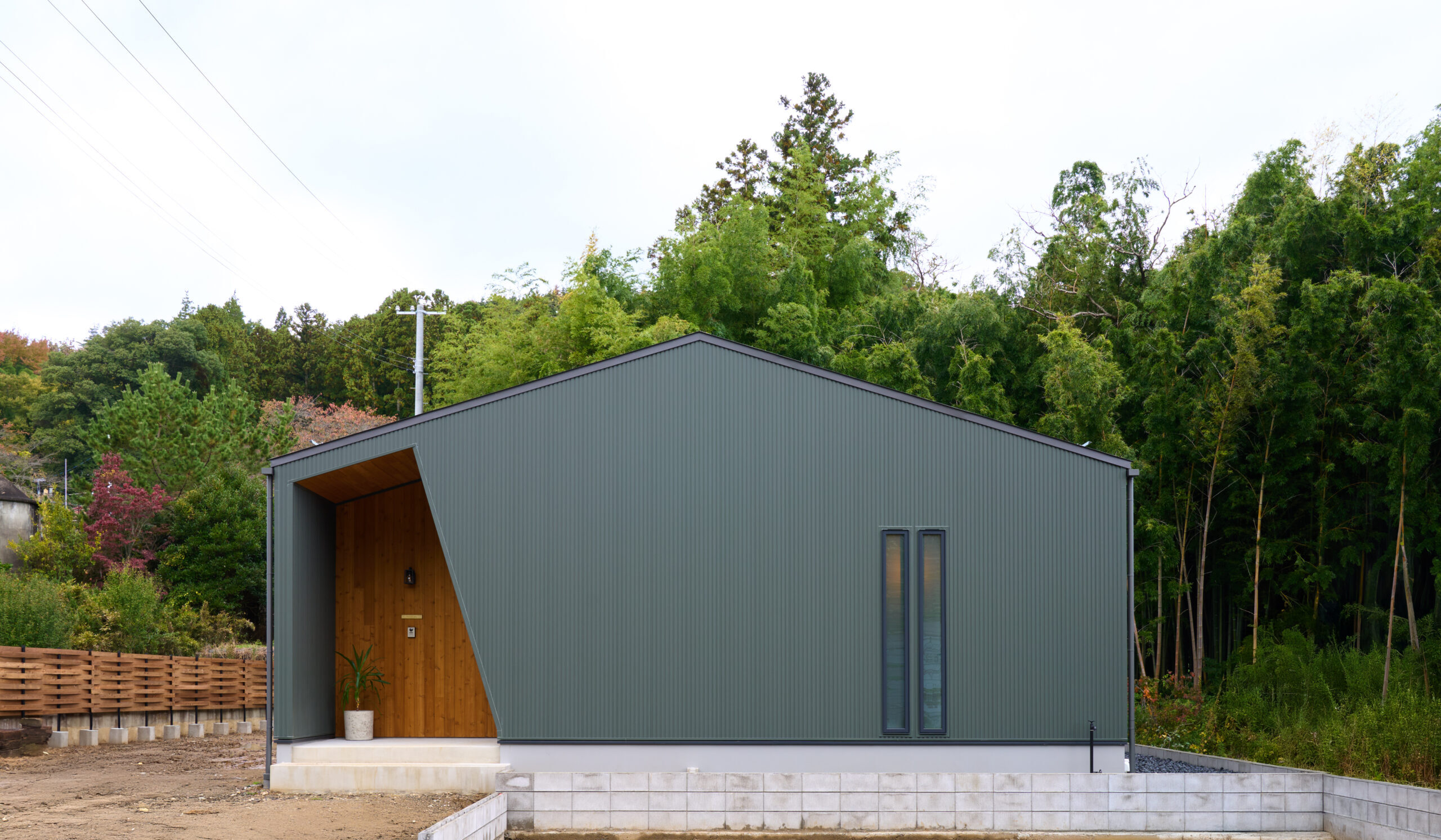 ミストグリーンのガルバリウム鋼板と天然木が組み合わせされた外観