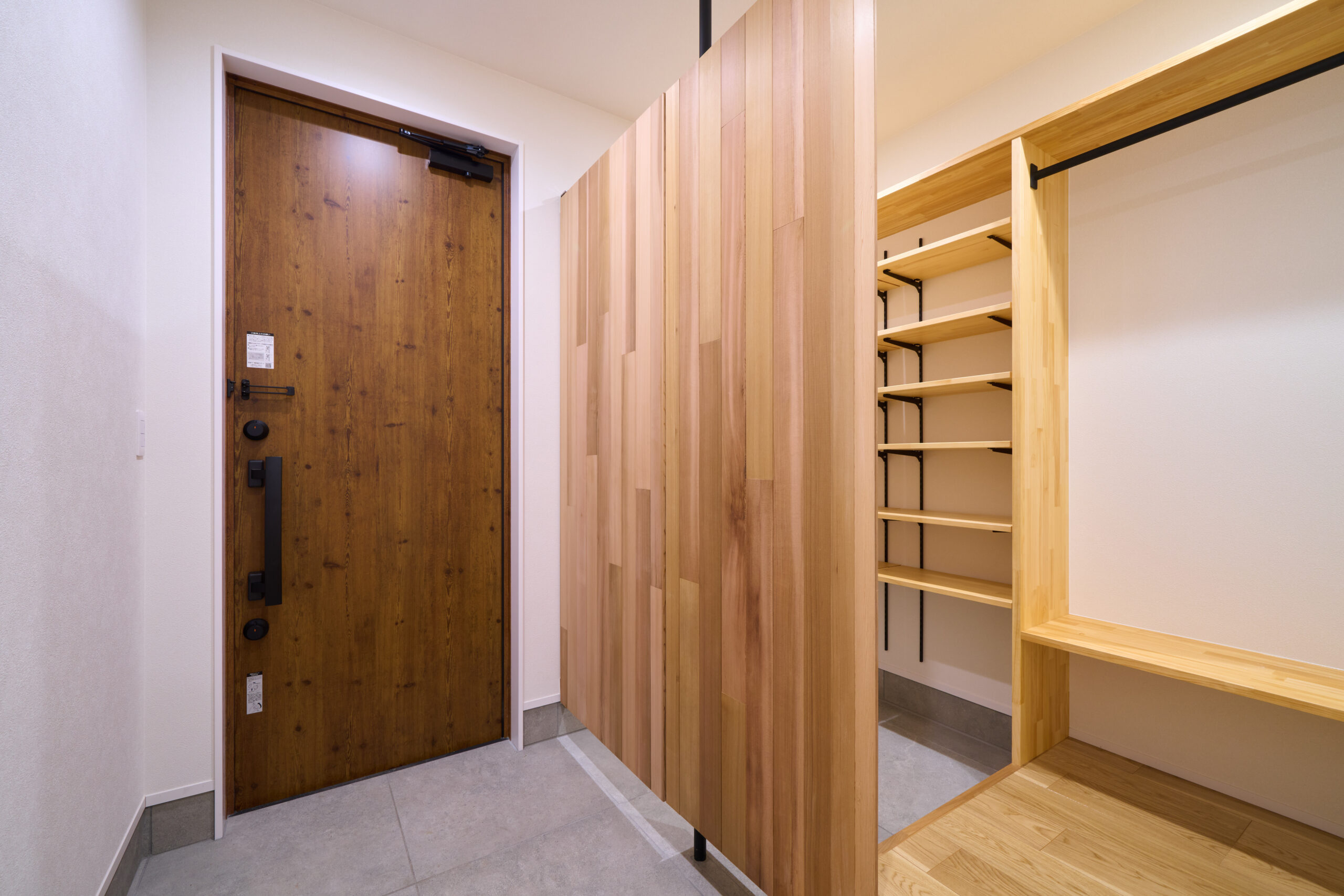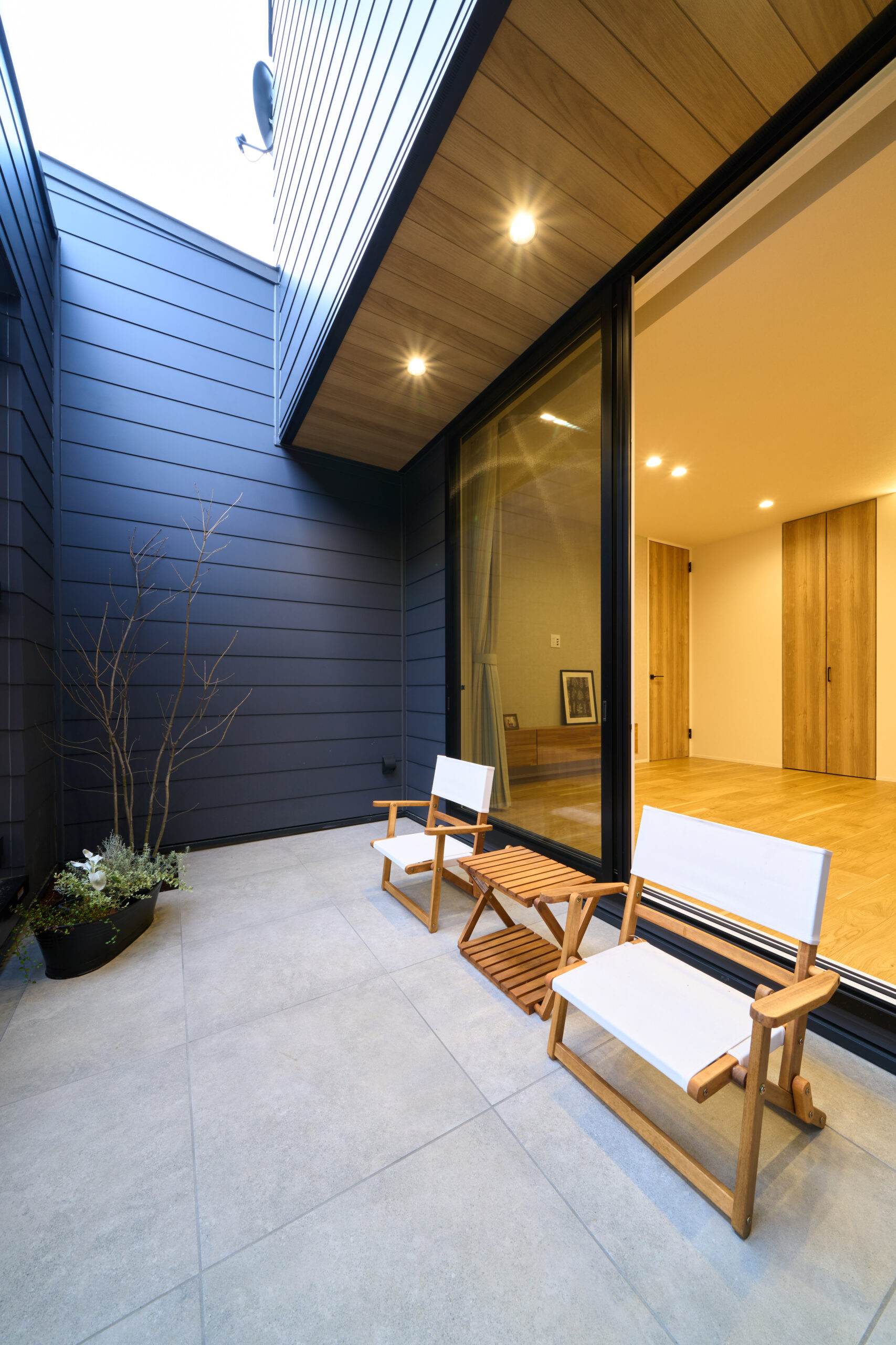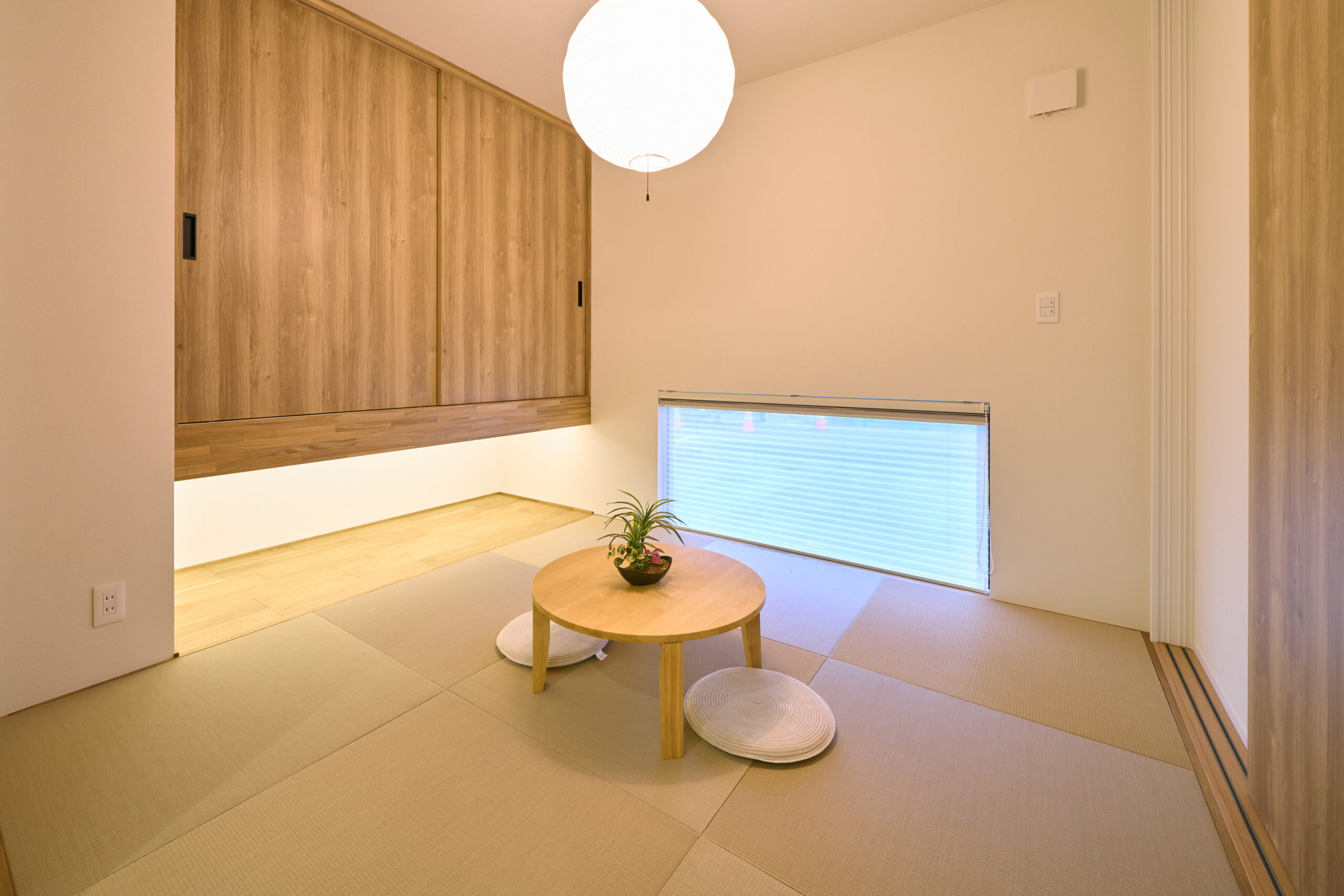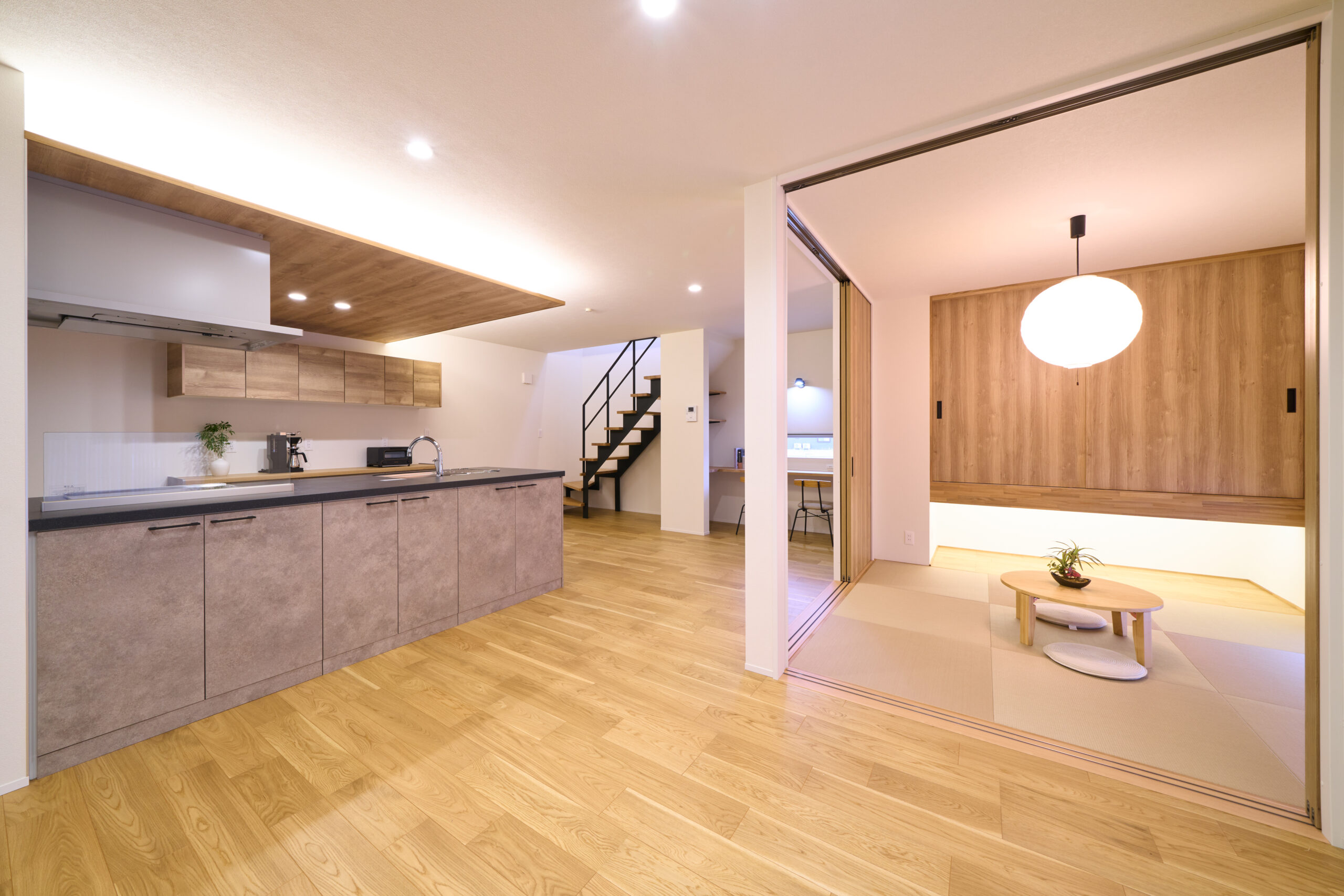 落ち着いた外観と、柔らかな灯りが映える「澄庭」。 深い色味の外壁と格子が、上質で静かな佇まいを生み出しています。 木のぬくもりを基調に、リビングと和室がゆるやかにつながる開放的なプラン。 外部格子のあるテラスからは、光と風を心地よく取り込み、名前の由来でもある“澄んだ庭”のような穏やかな時間が流れます。