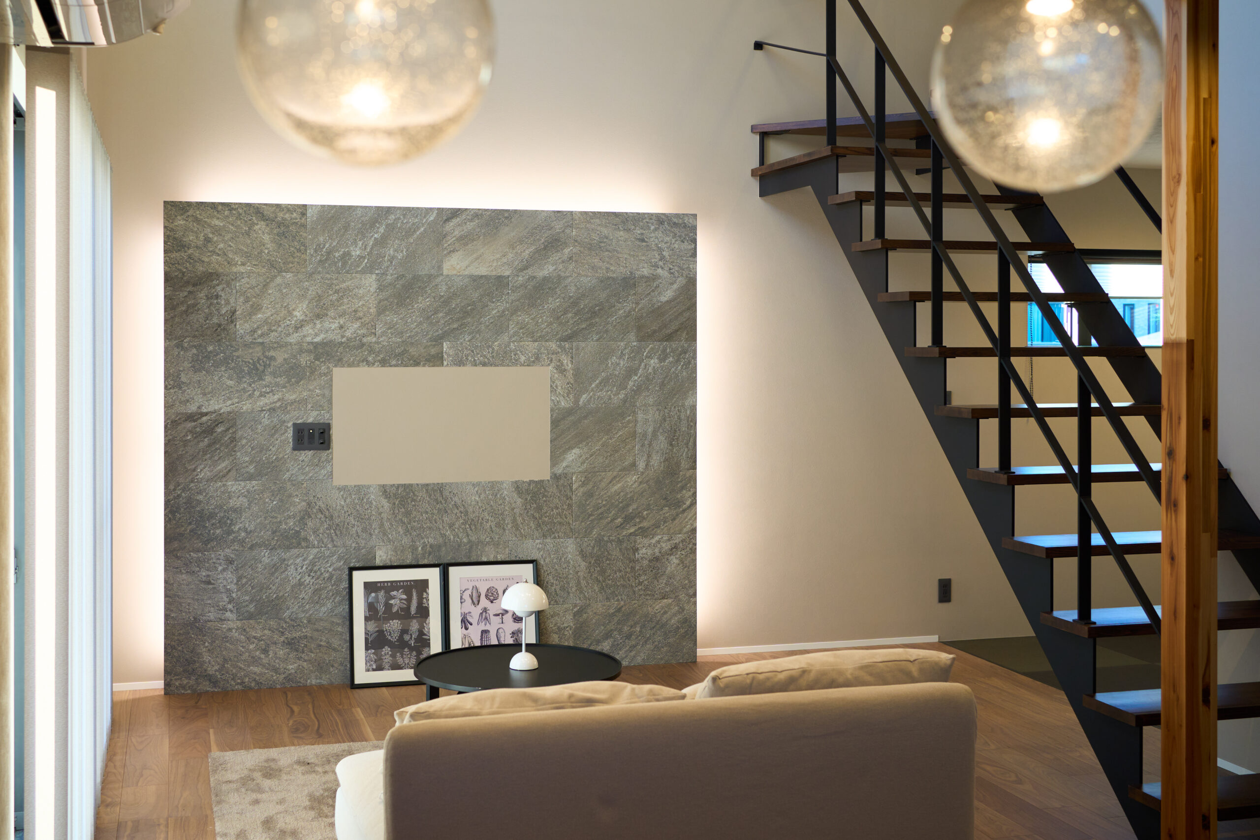 壁掛けテレビを設置するふかし壁にはエコカラットを採用し、上質なアクセントに。 背面に仕込んだ間接照明は、シーンに合わせて調光・調色が可能です。