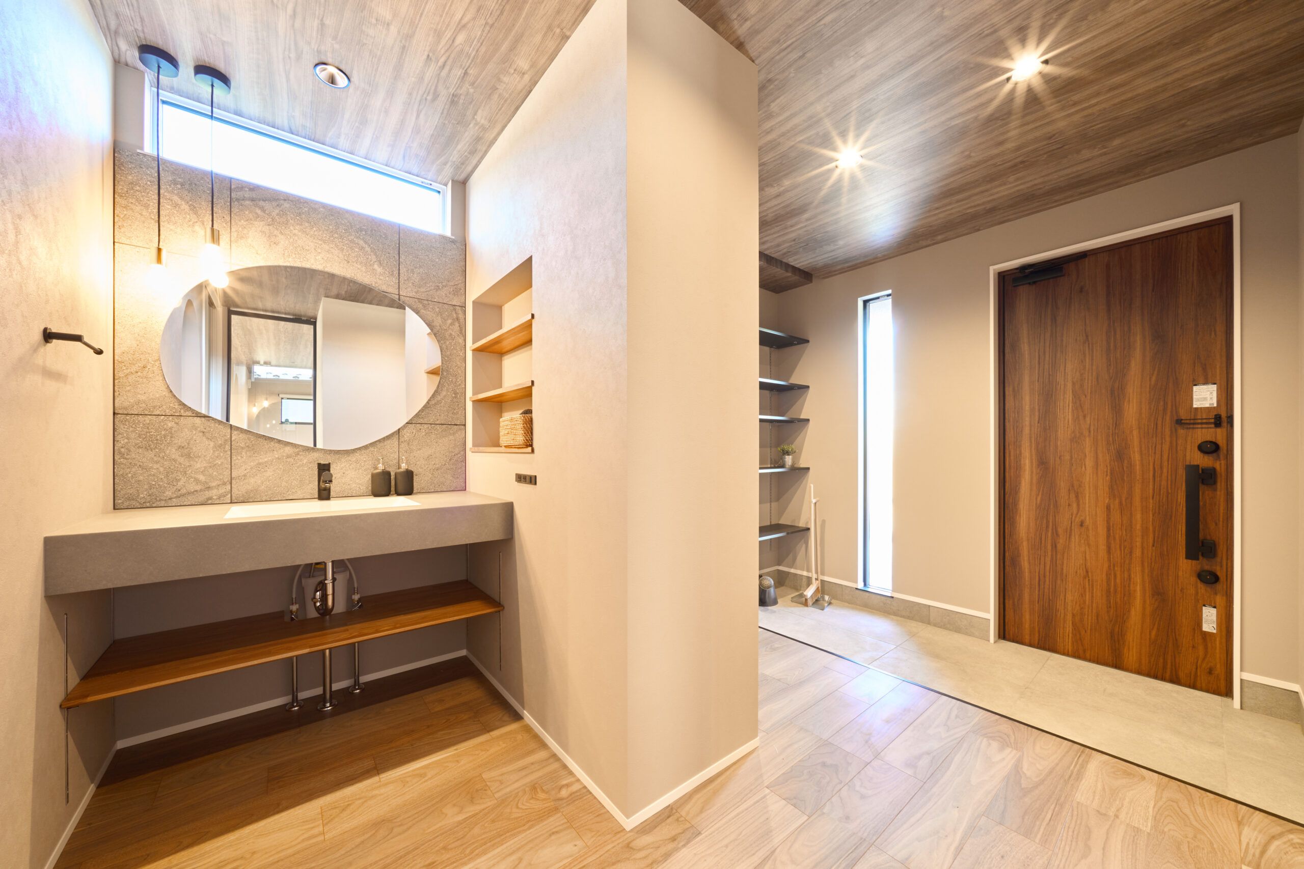 玄関は収納や仕切りを設けず、広々とした開放感のある空間に。 すぐそばに洗面所を配置し、帰宅後すぐに「ただいま手洗い」ができる便利な動線にしました。 洗面台は、お施主様のこだわりが光る造作デザインです。