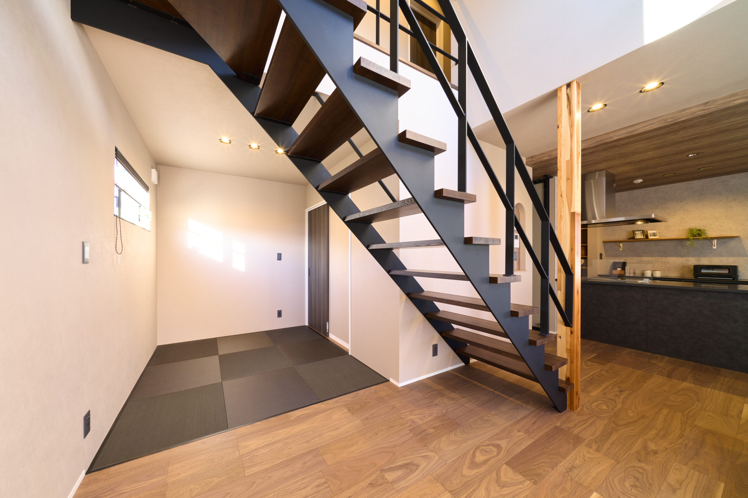 リビング階段をくぐり抜けると、シックな色合いの畳スペースが広がります。