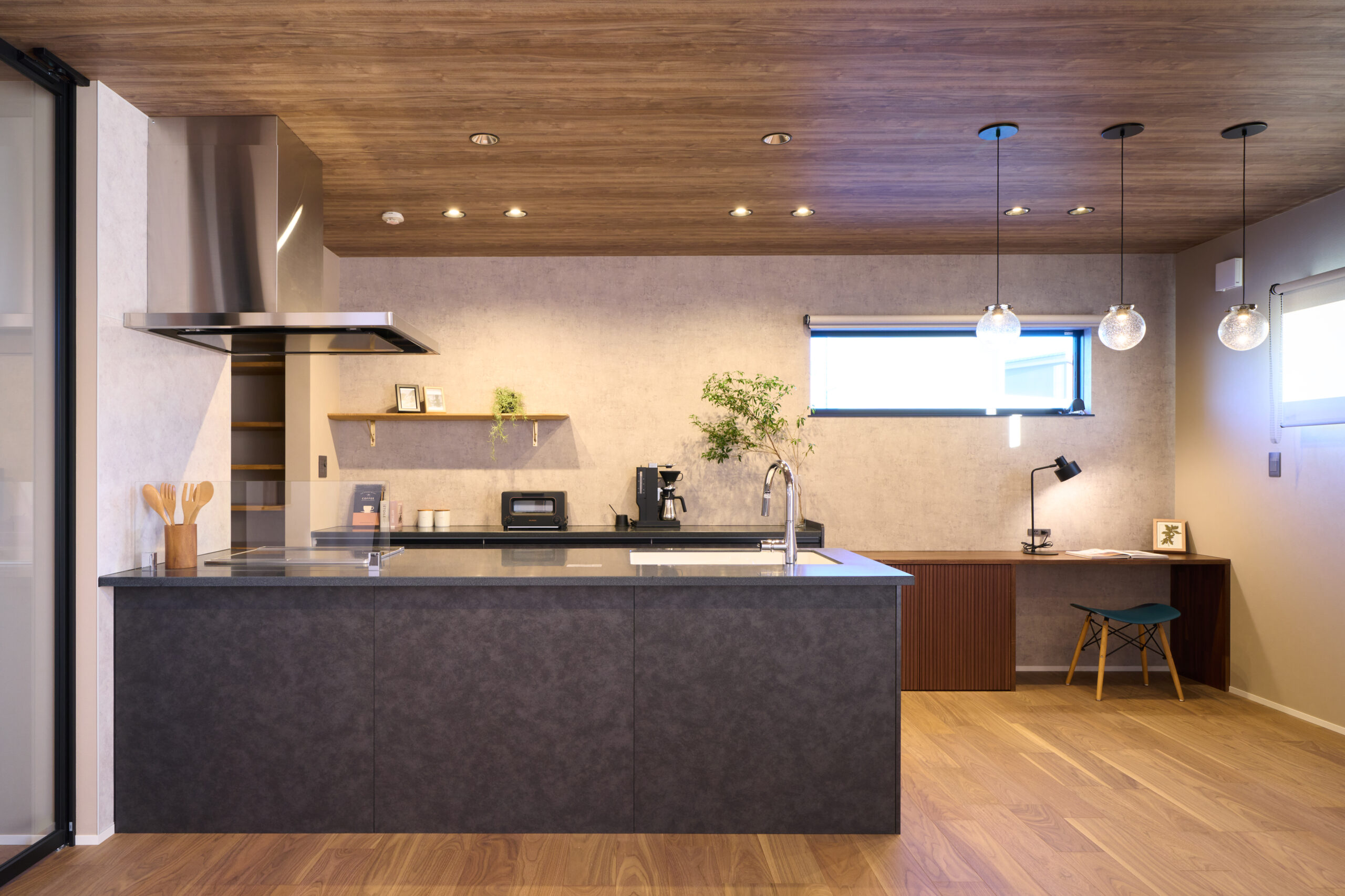 キッチンダイニングは流行りの対面式+横付けテーブルの設定に。 料理中でもリビングの様子が見渡せ、配膳もスムーズです。 色はブラックを採用し、空間に高級感をプラスしました。