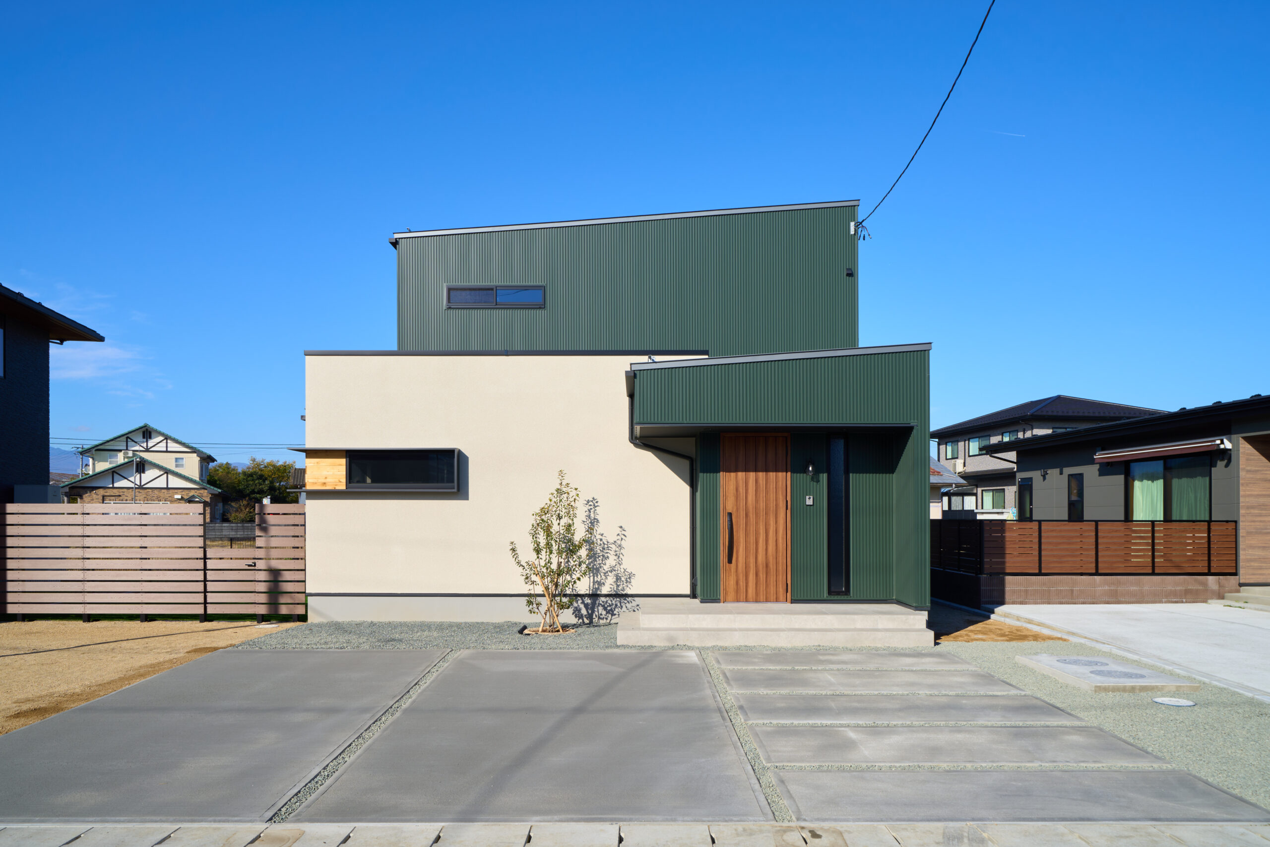 鮮やかなグリーンと優しいグレージュの塗り壁を組み合わせた、温かみのある外観。