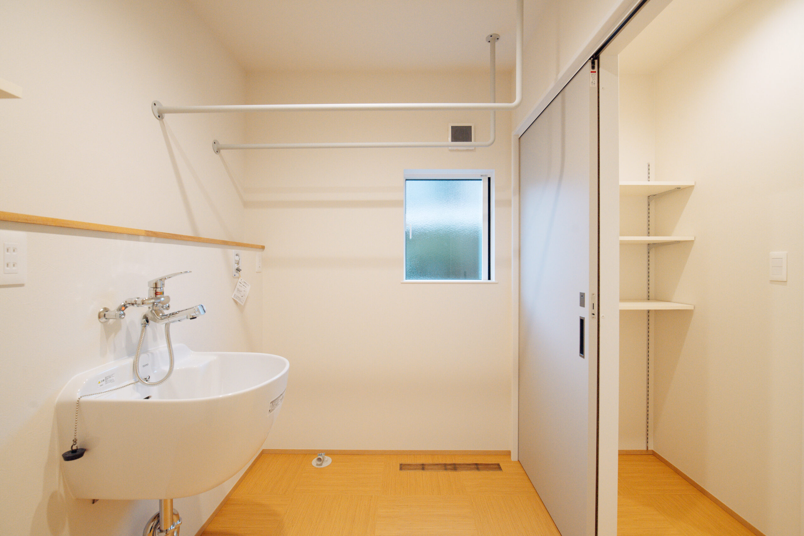 スロップシンクと造作ハンガーパイプを設置したランドリールーム。