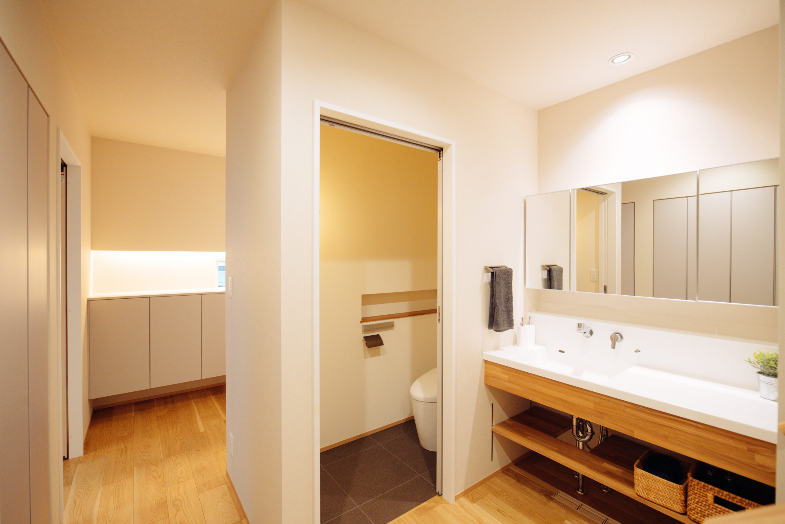 玄関ホールの近くには、造作洗面化粧台。おかえり手洗いスペースにも。