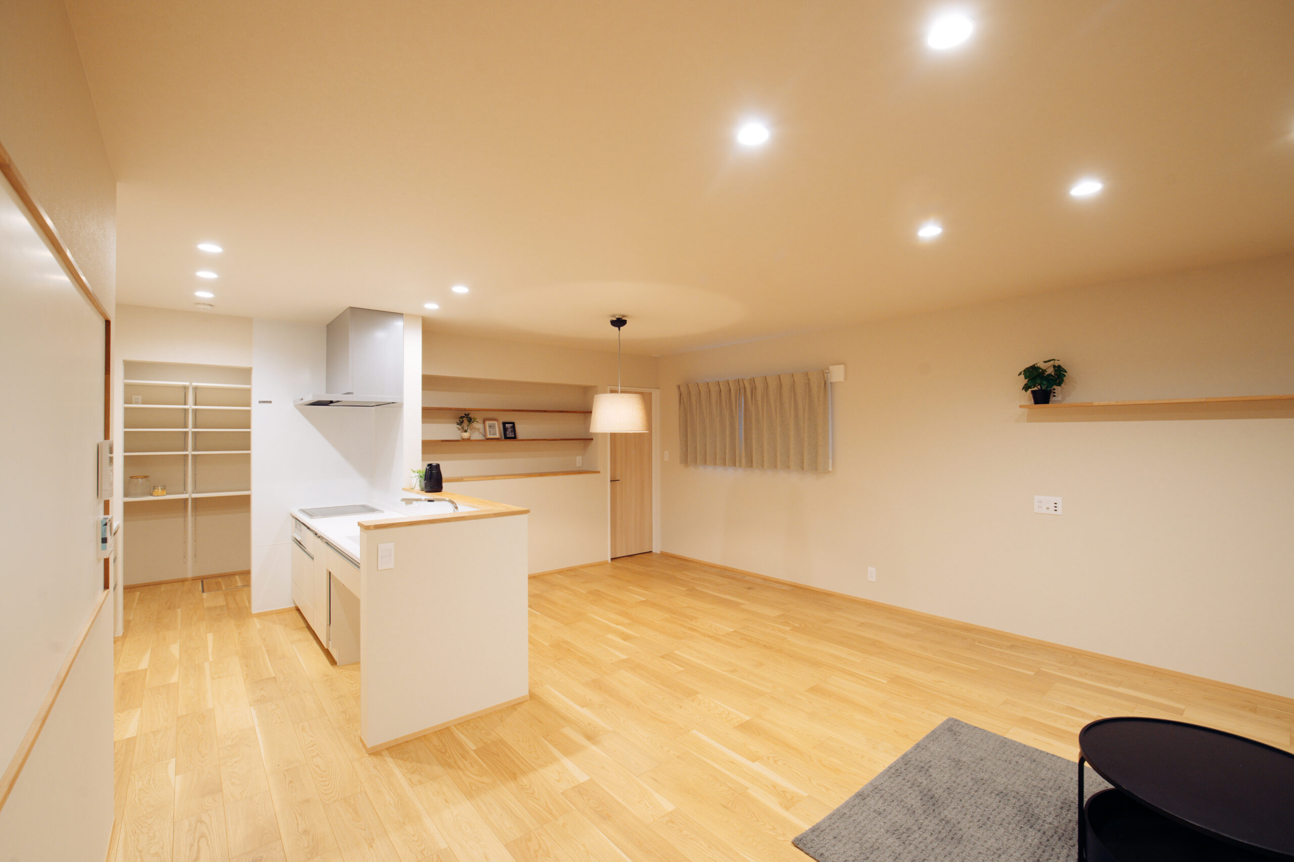 LDKはシンプルな形にこだわり、キッチン横のパントリーやダイニングの収納棚など、生活感をうまくしまえる工夫も随所に。